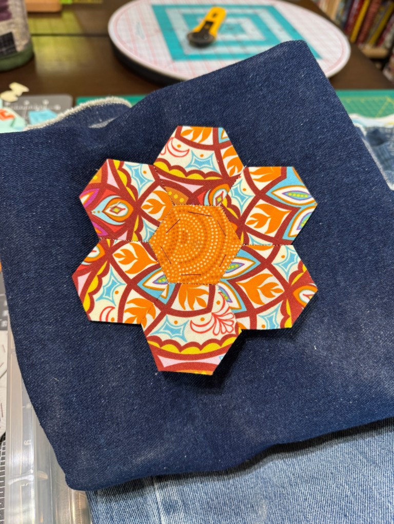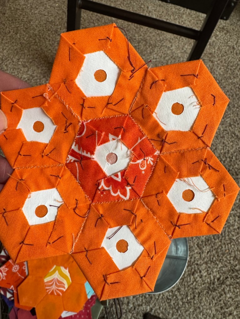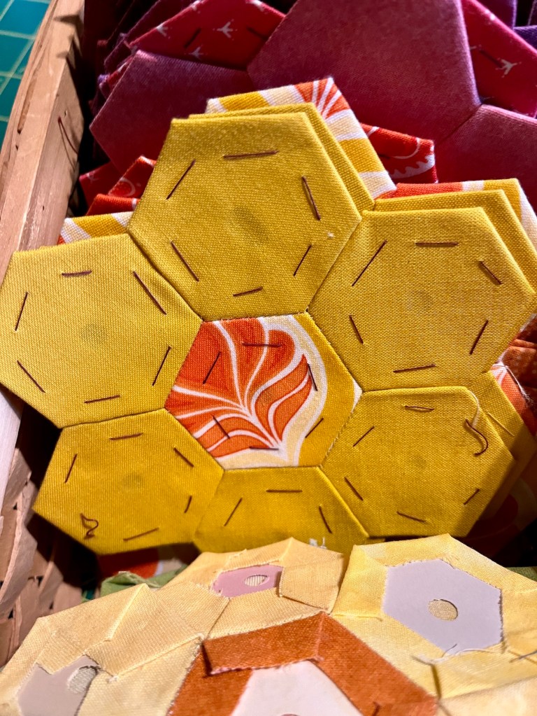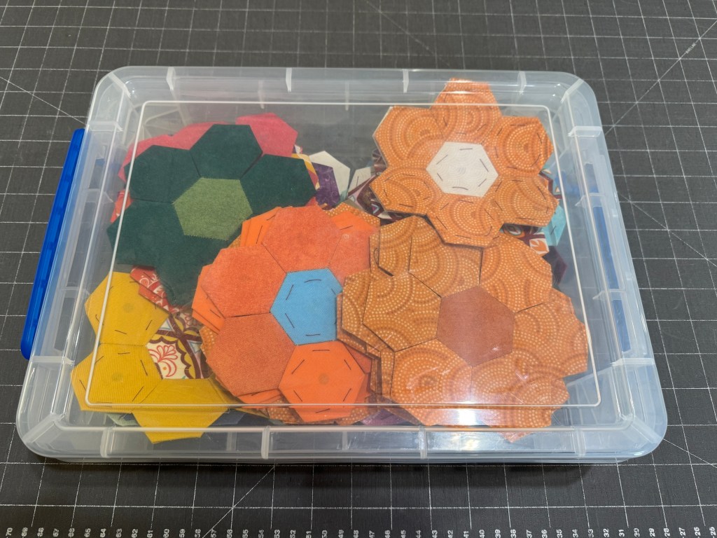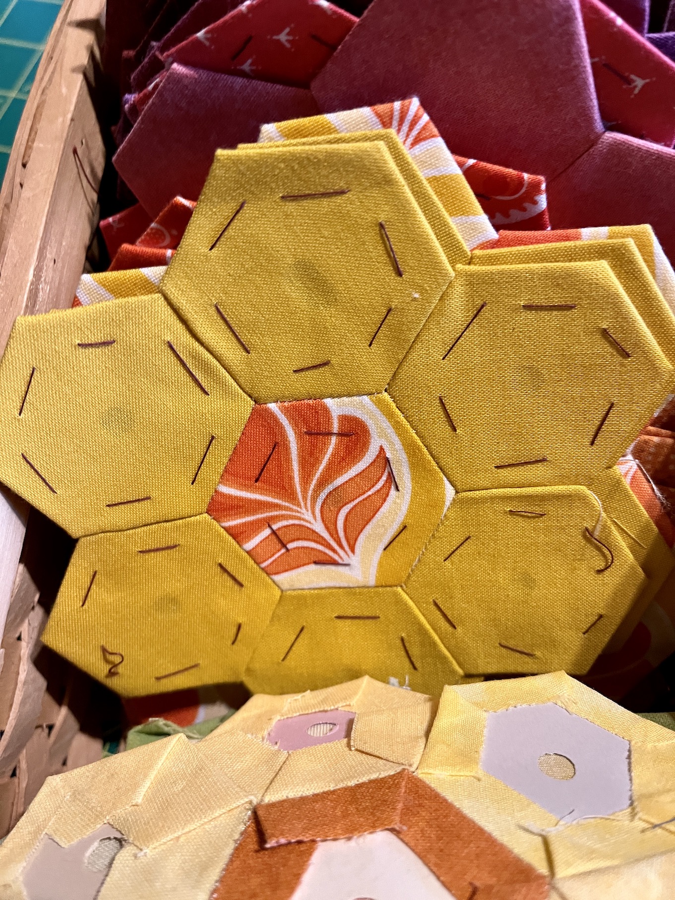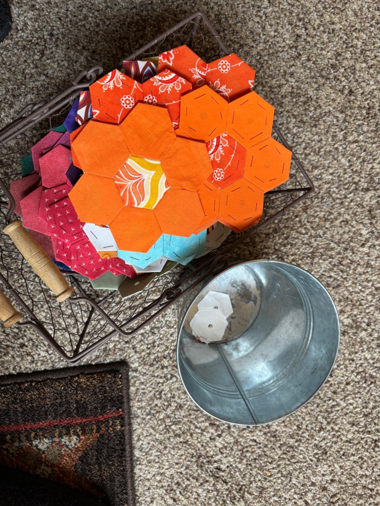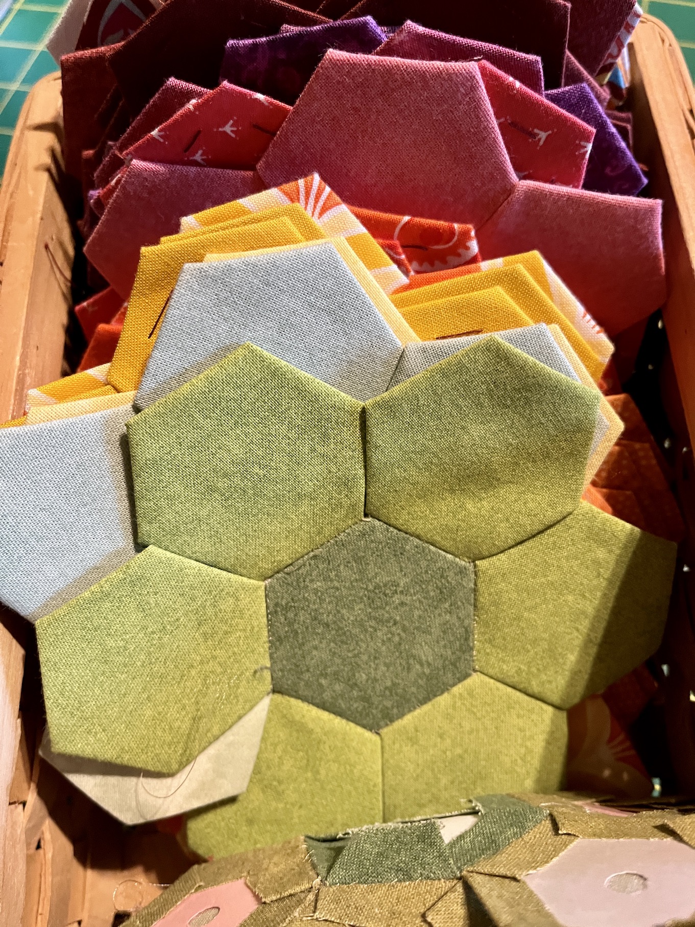 I finished paper piecing 99 hexie flowers (which each contained 7 paper pieced hexagons) in May 2024 from fabric scraps (that I sort of tried to coordinate).