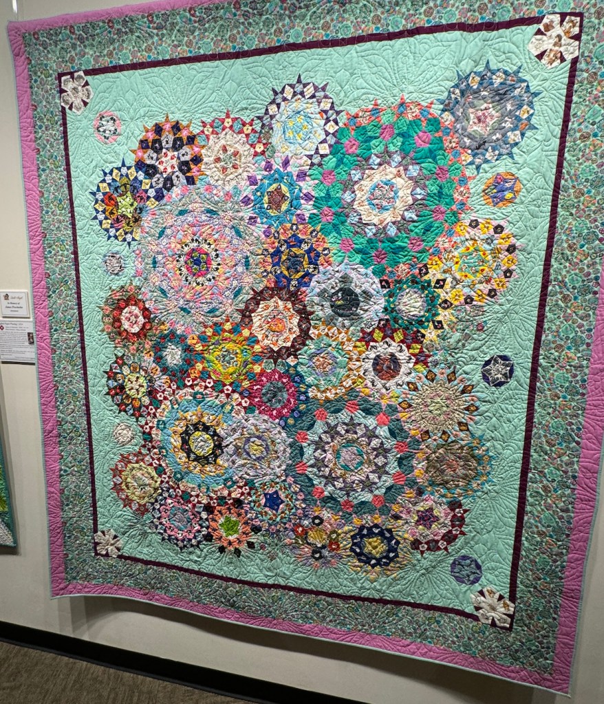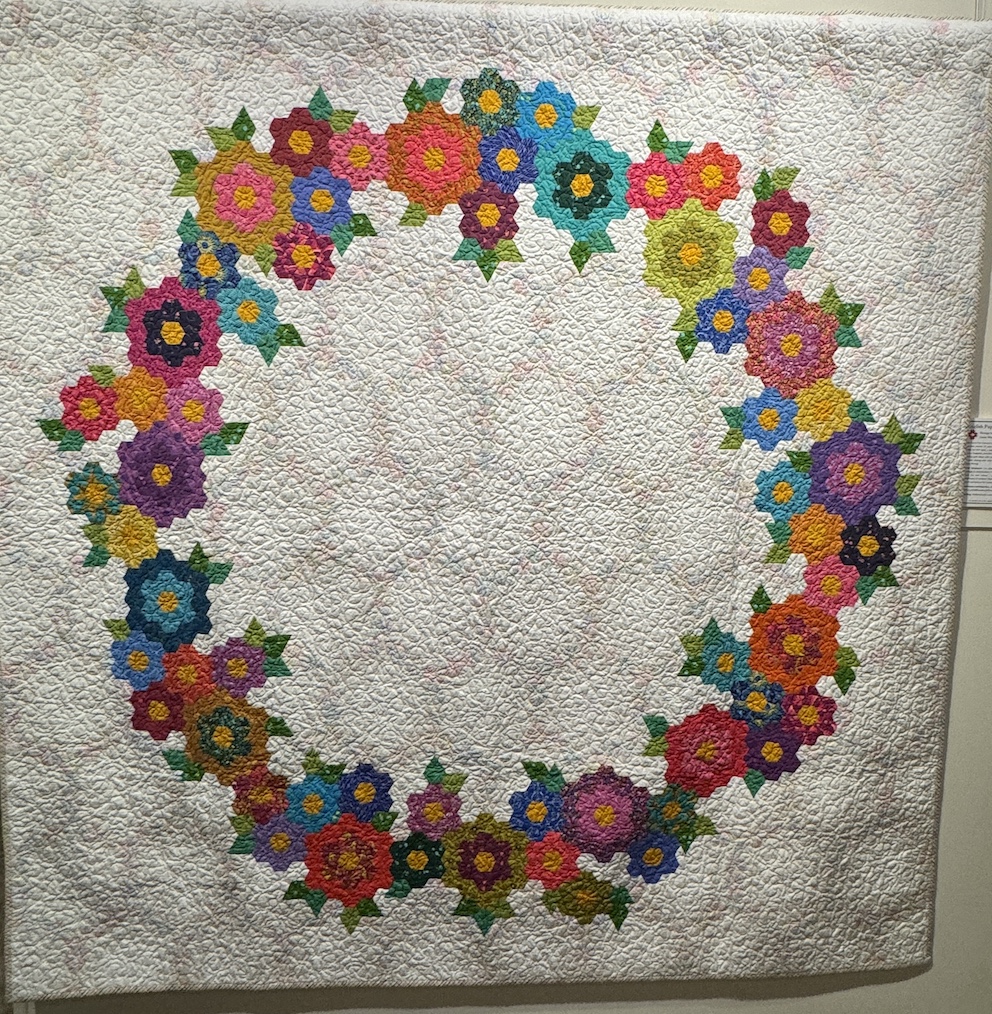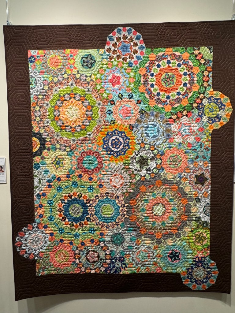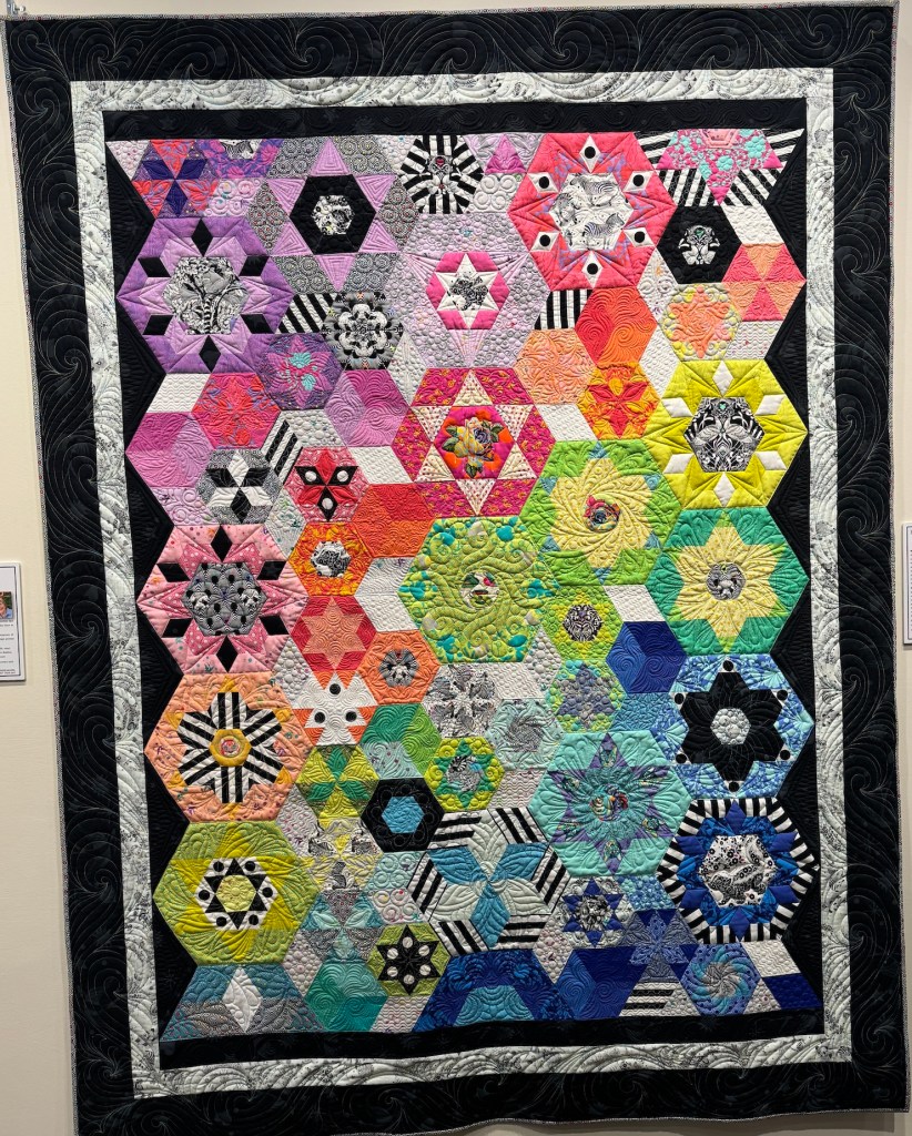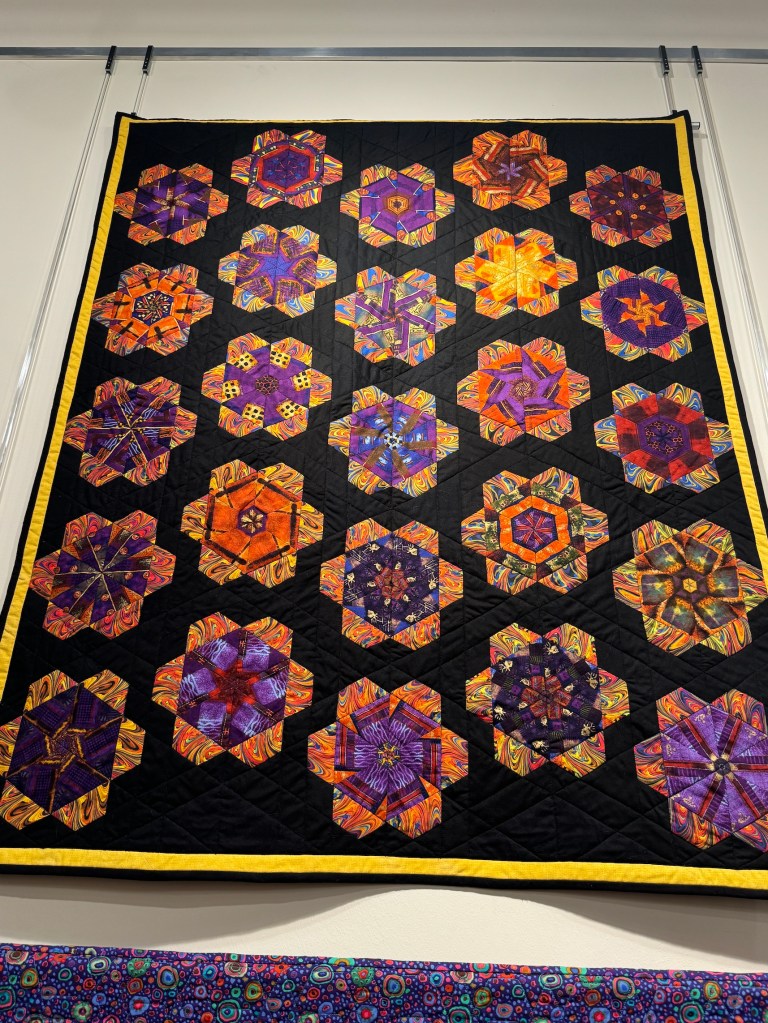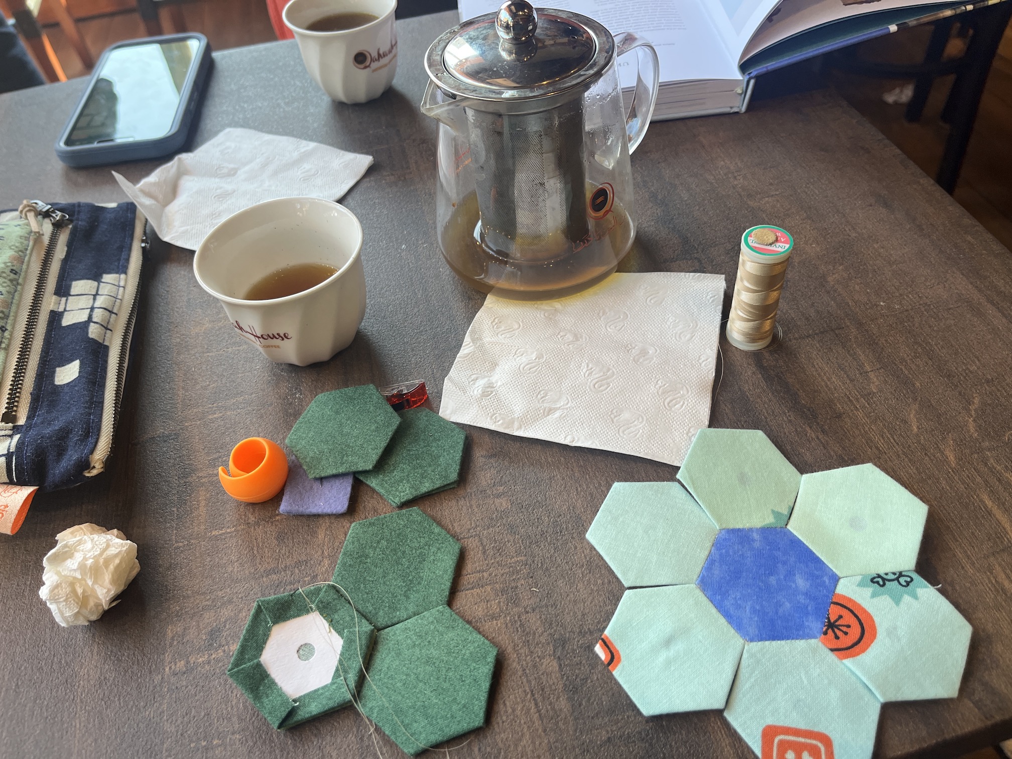 I finished paper piecing 99 hexie flowers (which each contained 7 paper pieced hexagons) in May 2024 from fabric scraps (that I sort of tried to coordinate).