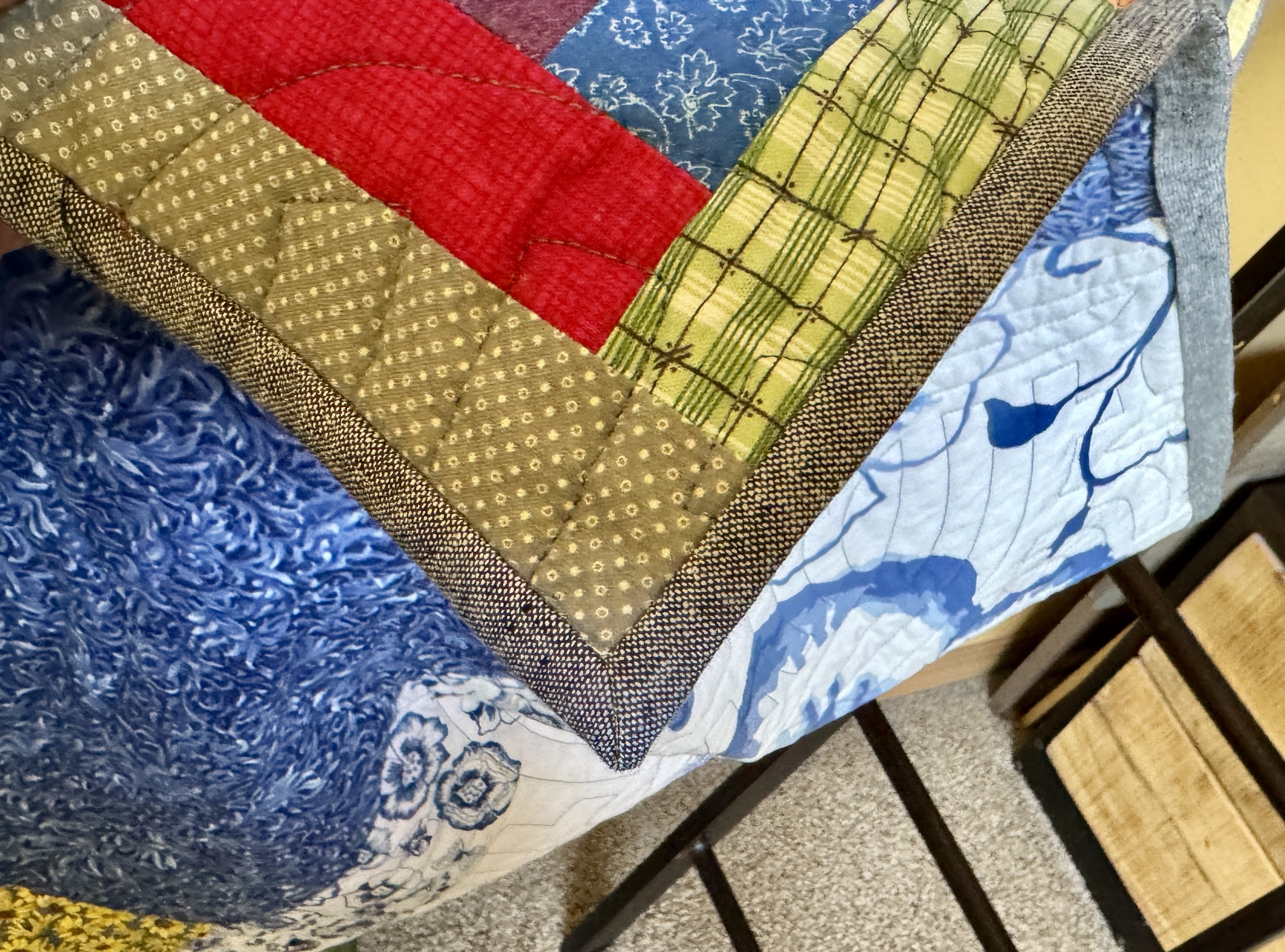 This binding has irritated me for years. I felt like I should have used black fabric to binding it, which would “frame” the piece. I have lots of pictures in black frames next to the wallhanging and it just seemed like a black binding was what the quilt needed to pull the whole alcove together.