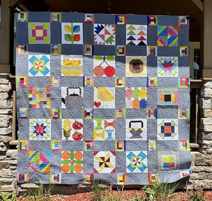 Quick story behind this quilt: I began working on blocks for this quilt at a quilt retreat back in 2017 (yes 8 years ago) when several of my quilting buddies were working on blocks from Lori Holt’s book Farm Girl Vintage. I am not into the “farm girl” aesthetic but the blocks looked so fun; and I was drawn into the fun and excitement my friends were having making the blocks.