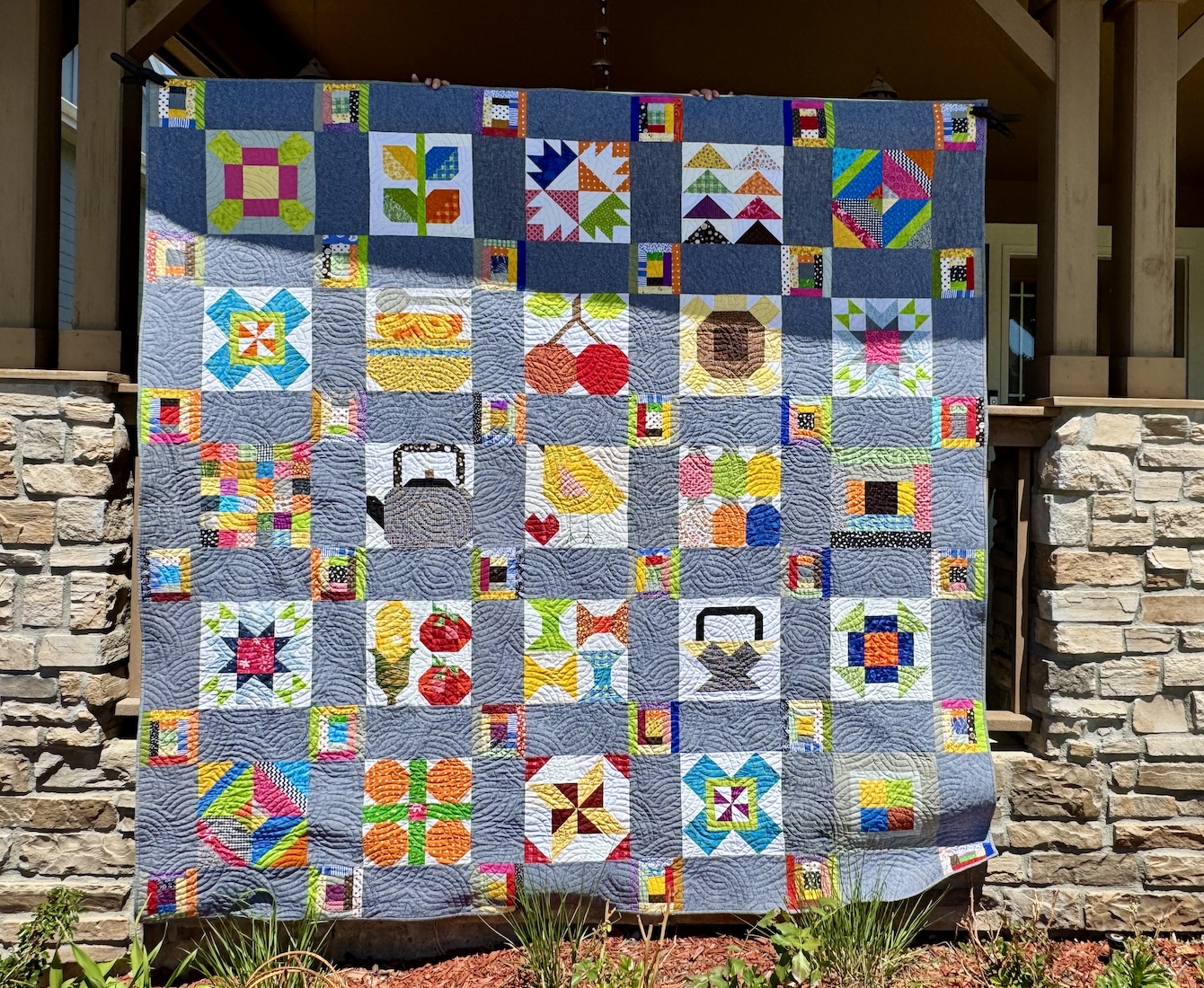 I put the quilt together fairly quickly and did simple quilting on it years ago. I put a quick binding on it using the same Stonehenge fabric I used for the border of the quilt.