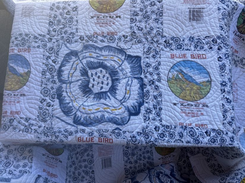 And here is a little section of the quilted back of the quilt with the Cortez Mill Flour sacks and disassembled recycled duvet cover: