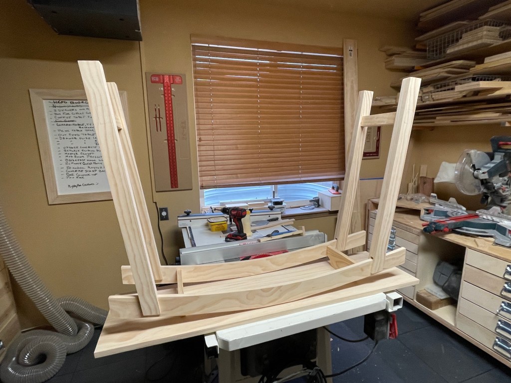 While I was remodeling a blanket, John has been busy in his workshop making a cabinet for the upstairs primary bathroom. For years I’ve just had shelves about the “water closet” room the toilet in the primary bathroom resides in, and finally John is adding a cabinet.