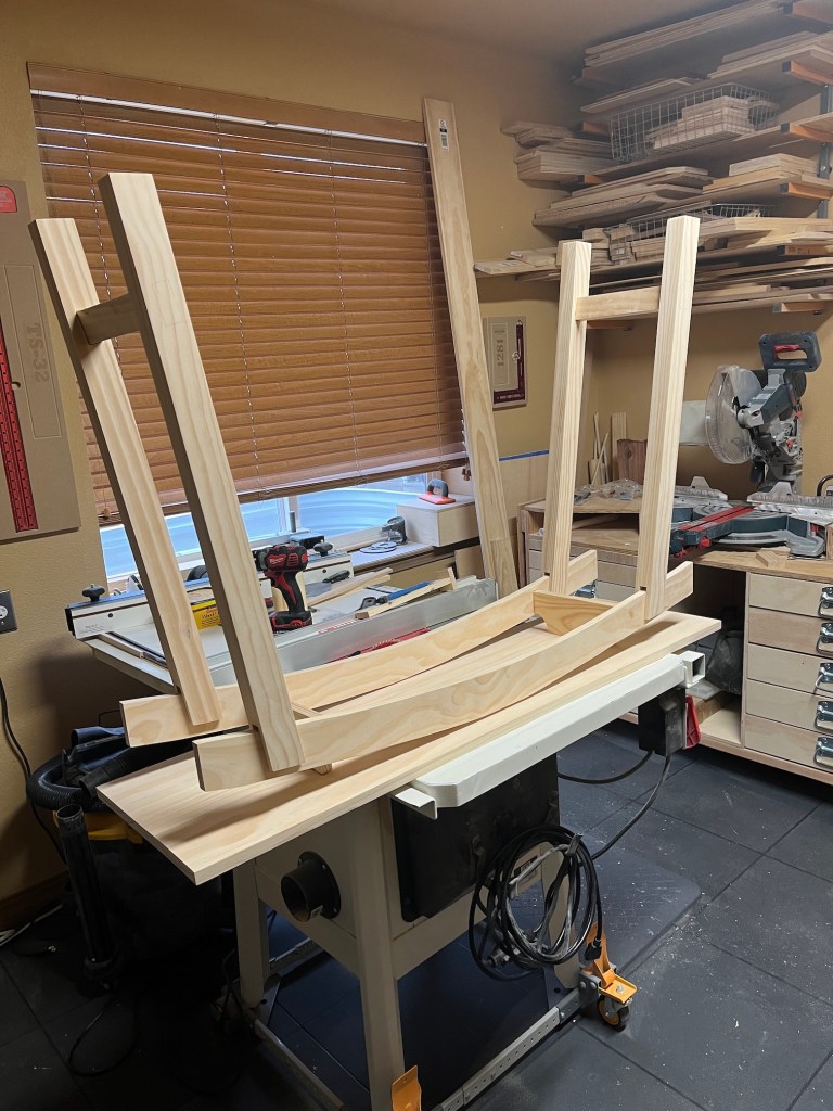 Here is the bench in progress in his workshop and then in the garage being stained (John designed the bench without formal plans/pattern from watching YouTube videos and looking at online ideas for benches!):