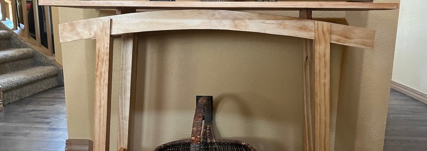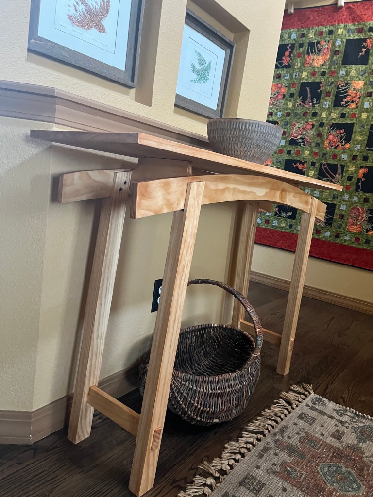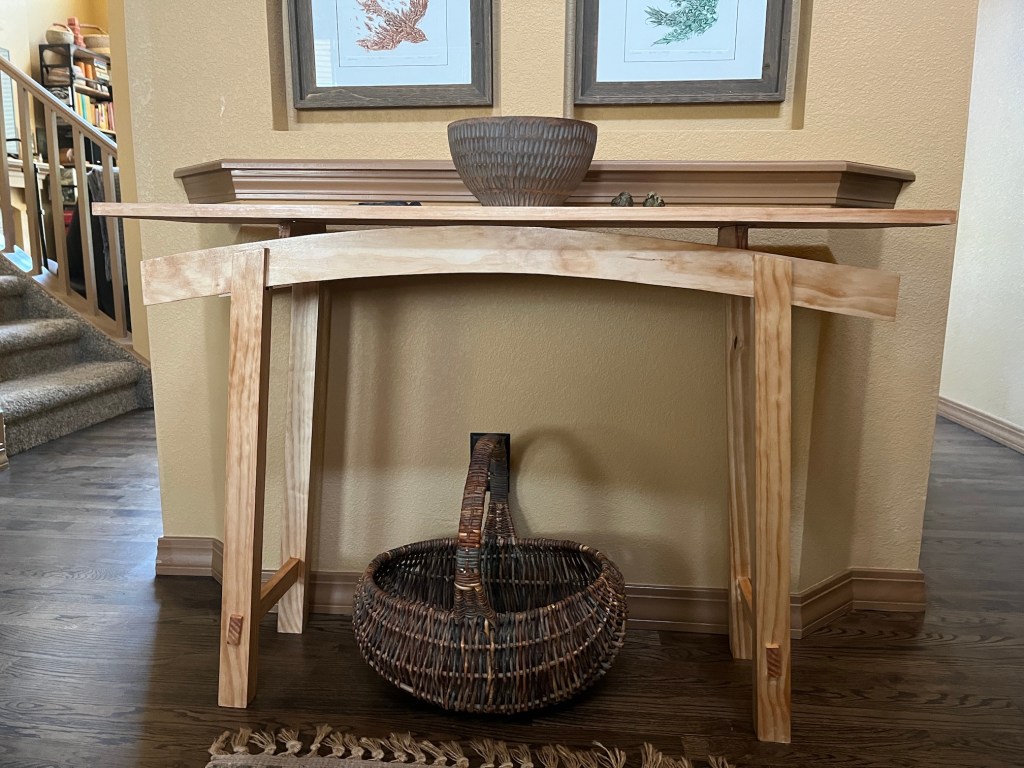 Recently he found time to work on a new woodworking piece, and has recently finished a pine floating top table. The table was originally to be used as sofa table in our basement but it came out so cool, we decided to put it in the entryway.