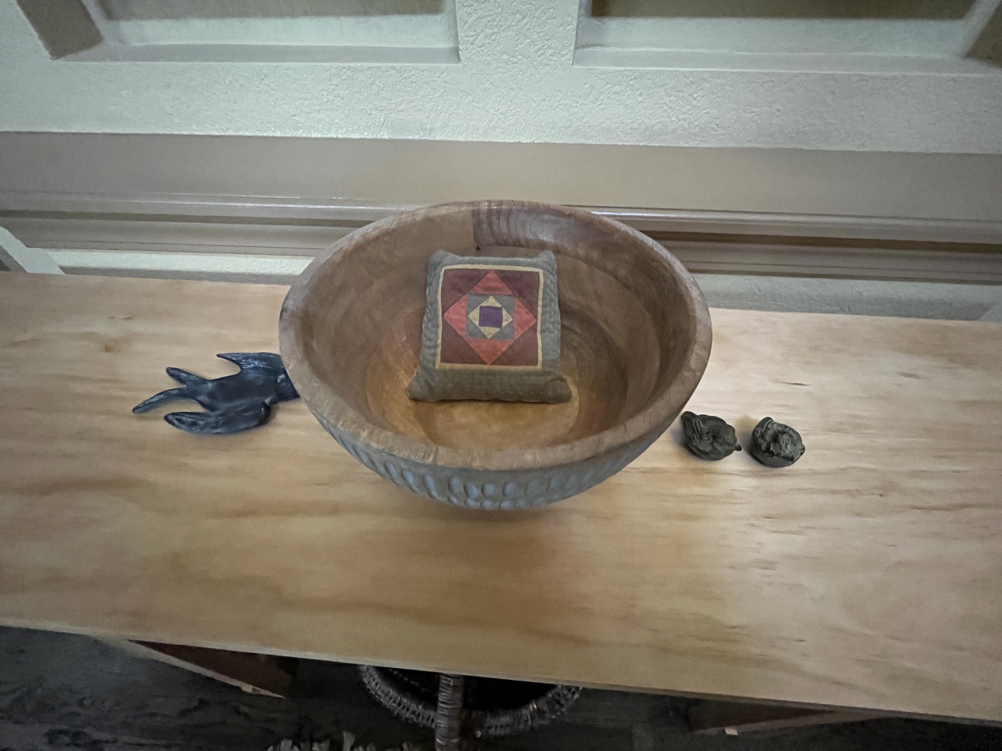 I put a bowl I found last year at a second hand store with a little pillow I made on the top of the table. There are bird illustrations on the wall behind the table, so I also placed a little bird dish my friend Kathy got me and two little birds that were a favorite of John’s late wife.