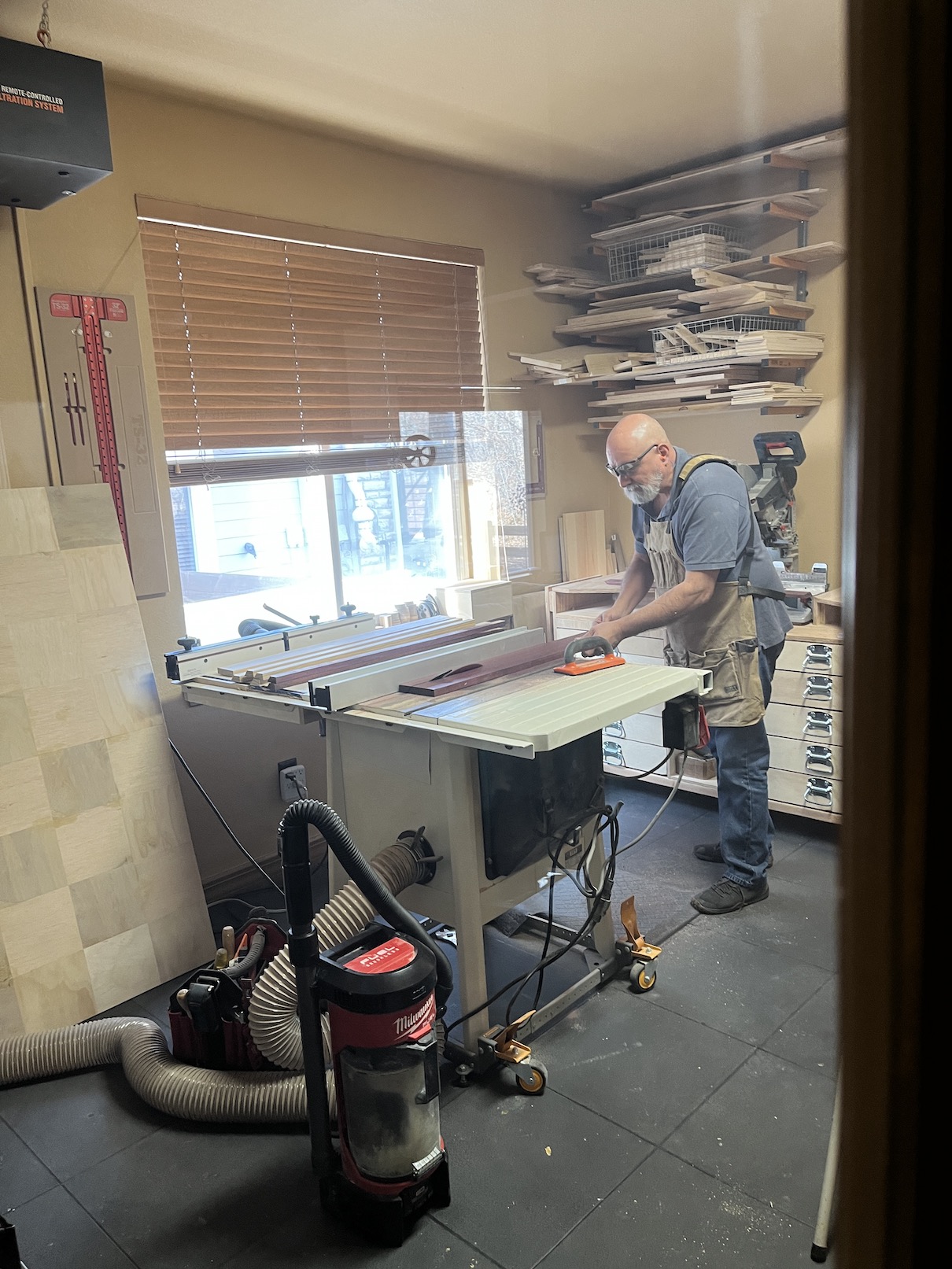 Here is John in his workshop in our basement where he made cutting boards for our home and as holiday gifts; and a “laundry machine/dryer topper” board (I made the name up but you’ll see what I mean in the photos below) in November and December:
