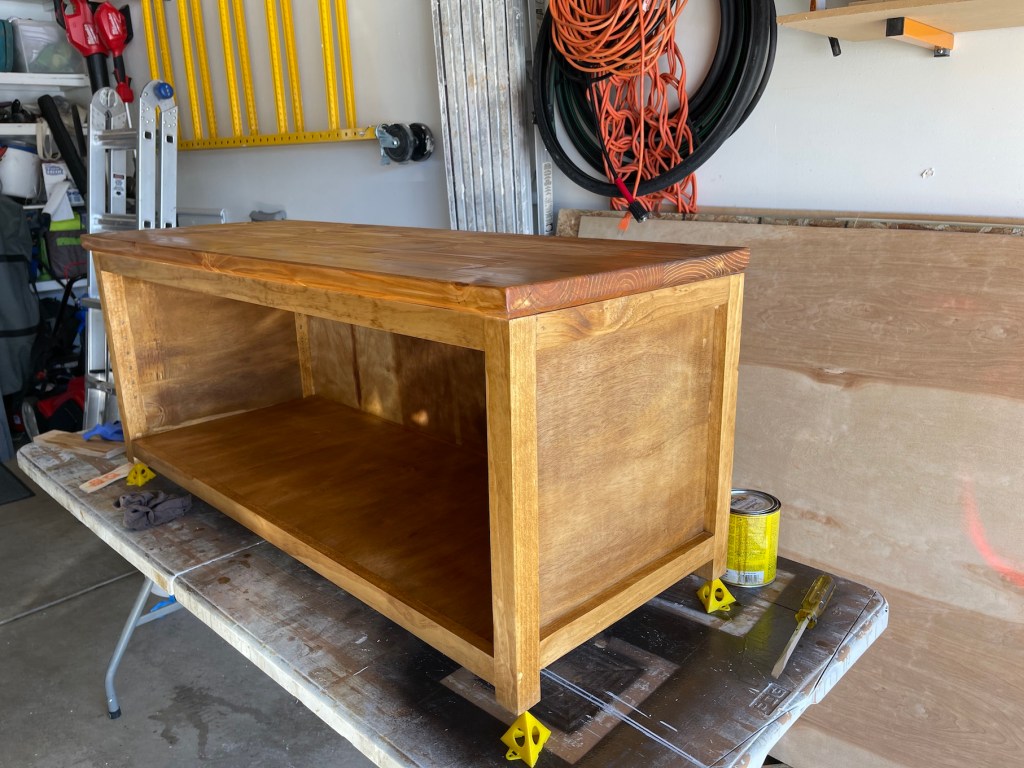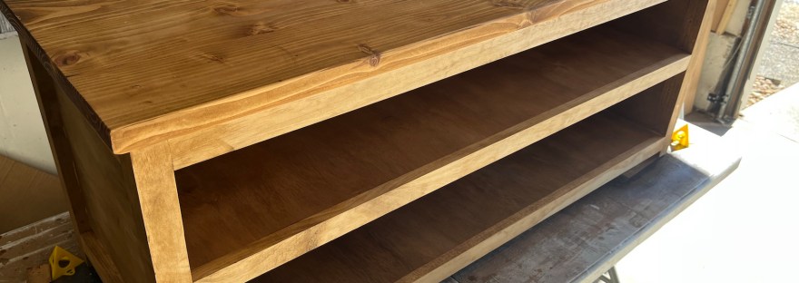 John recently finished making us a new entertainment console for under the television in the basement den area. Thought I would share some photos from his build to completion: