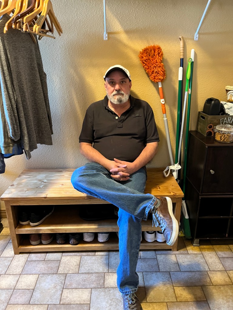 John did try and spruce up the laundry room/mudroom by building a topper/board for the washer and dryer a couple months ago (see post Never Bored When Making Boards (From the Woodshop)), as well as putting in a shelf above them. But still when you first walk into the area from the garage there is no place to sit and take off your shoes…plus it is kind of messy and cluttered there with Mike the Miniature Schnauzer’s dog food, our reusable bag collection, clothes that are hanging dry, and various random crap.
