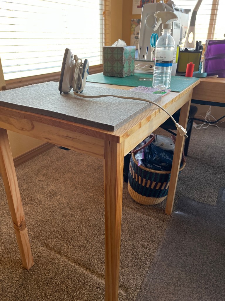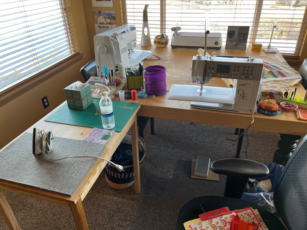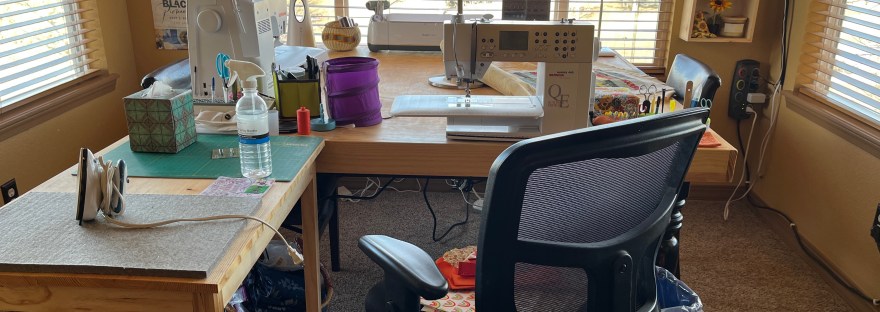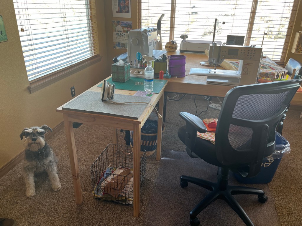 We also discovered the desk is great for me to sew on my Beastnina, so I can help Tierney out with her backlog of UFOs (unfinished objects for the non-quilters reading):