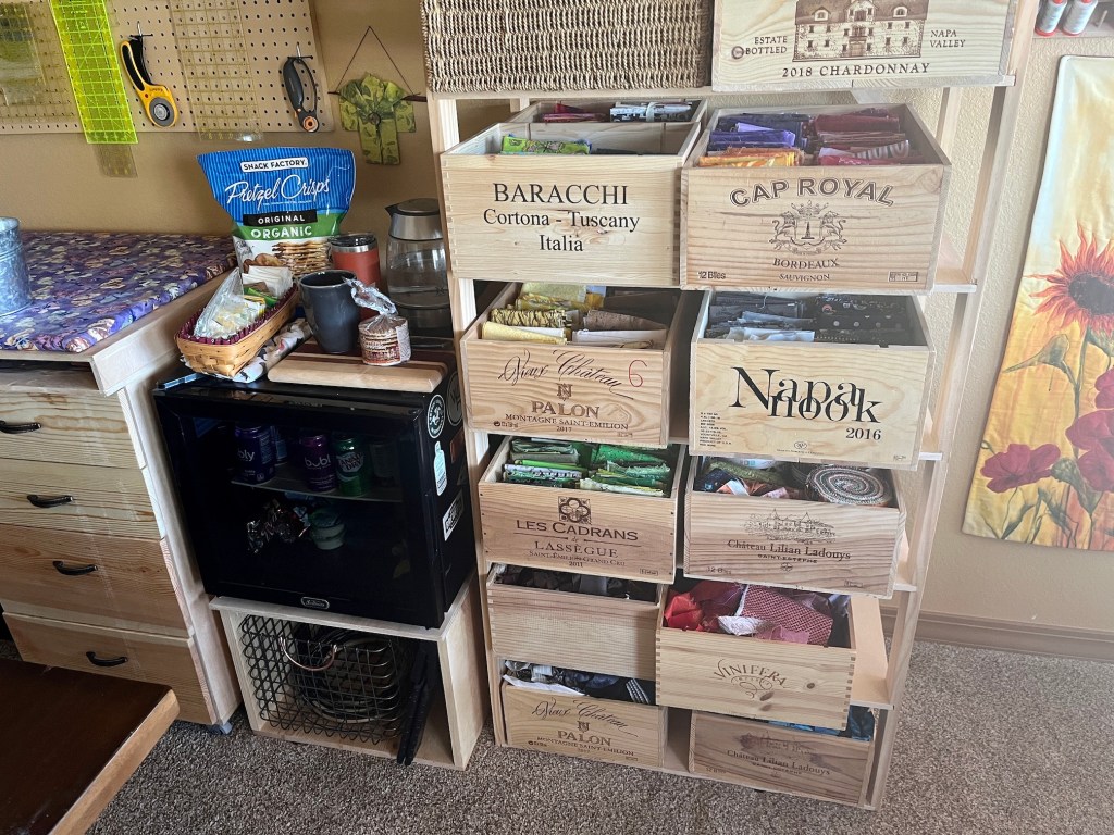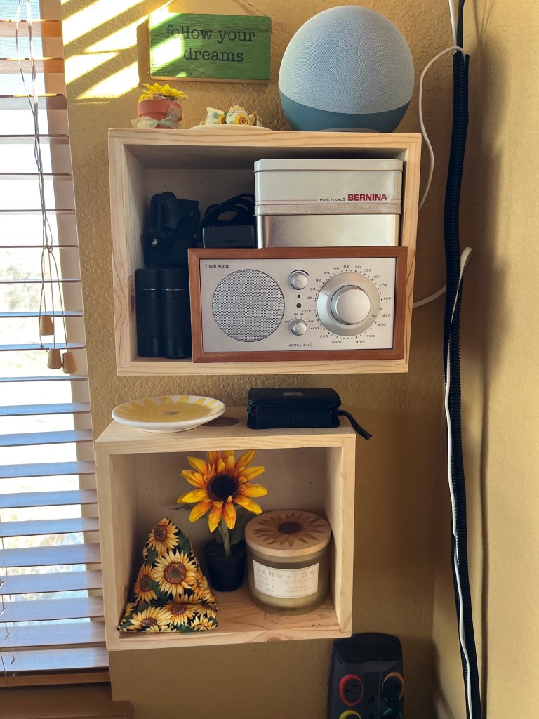 When John was first teaching himself (via books and YouTube videos) on how to make drawers, he made a lot of practice boxes to start. He recently repurposed a couple of those practice boxes as some additional storage for my studio: