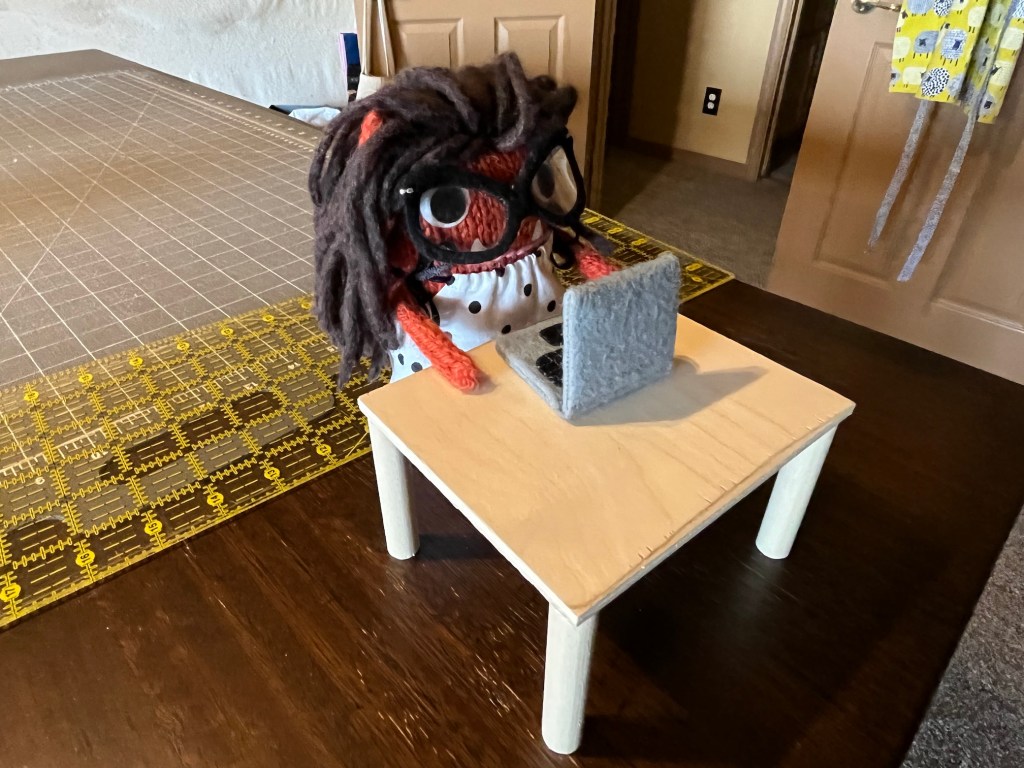 We also discovered the desk is great for me to sew on my Beastnina, so I can help Tierney out with her backlog of UFOs (unfinished objects for the non-quilters reading):