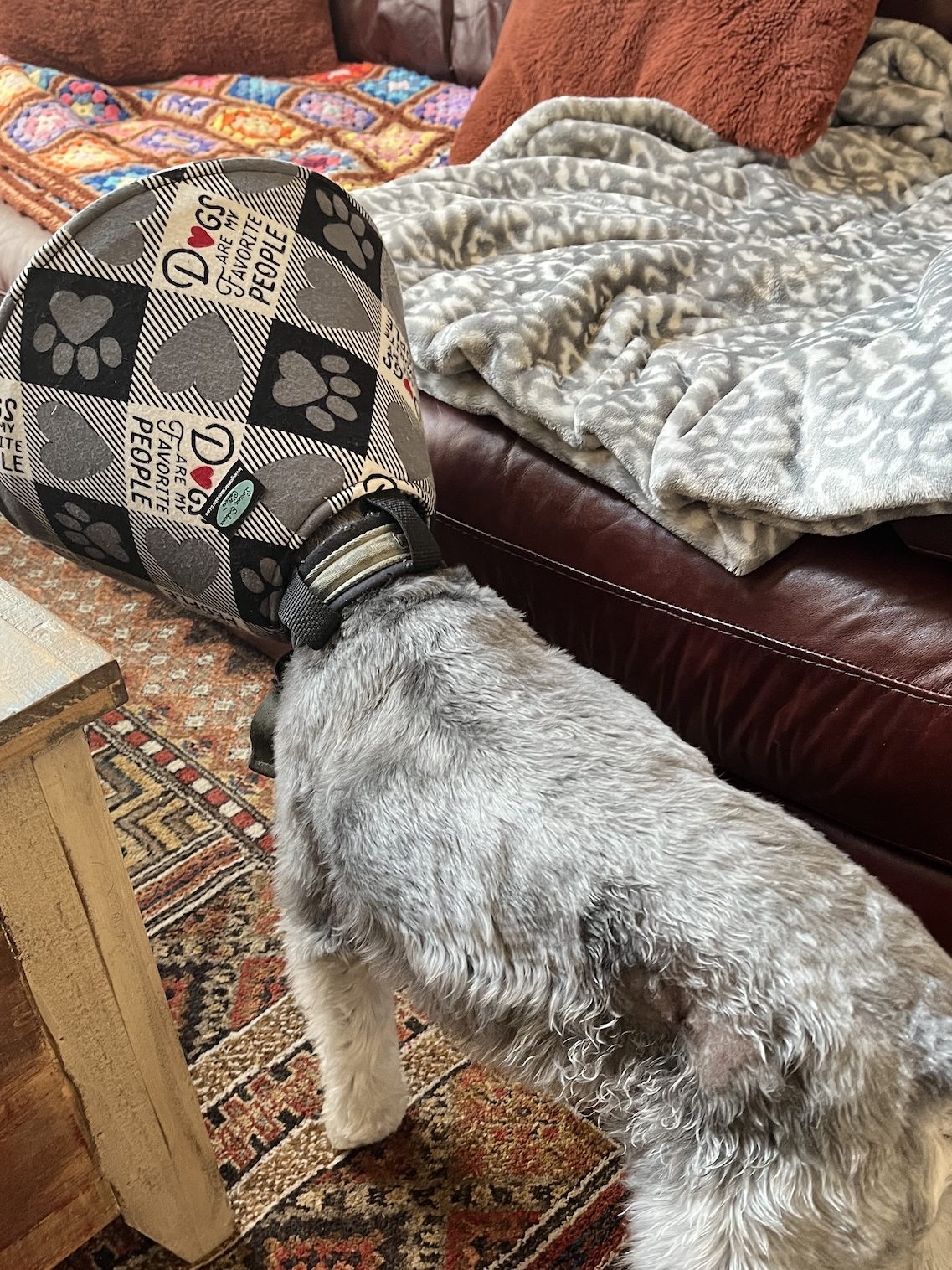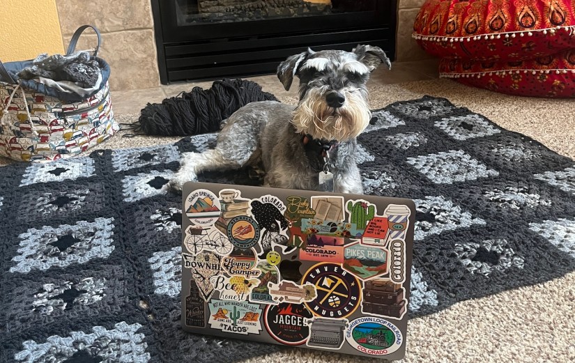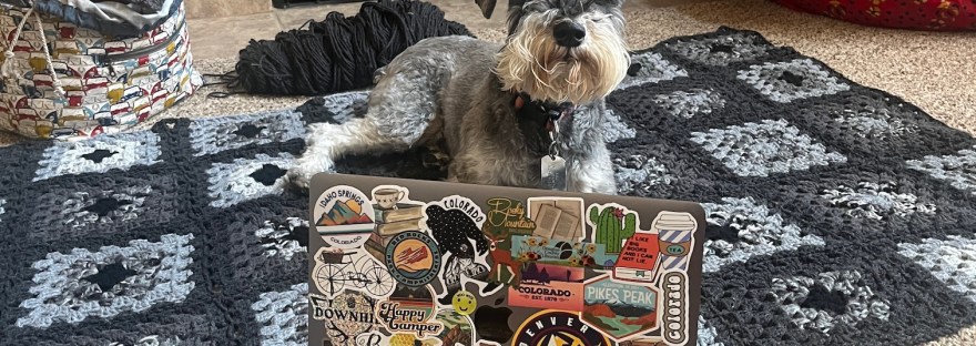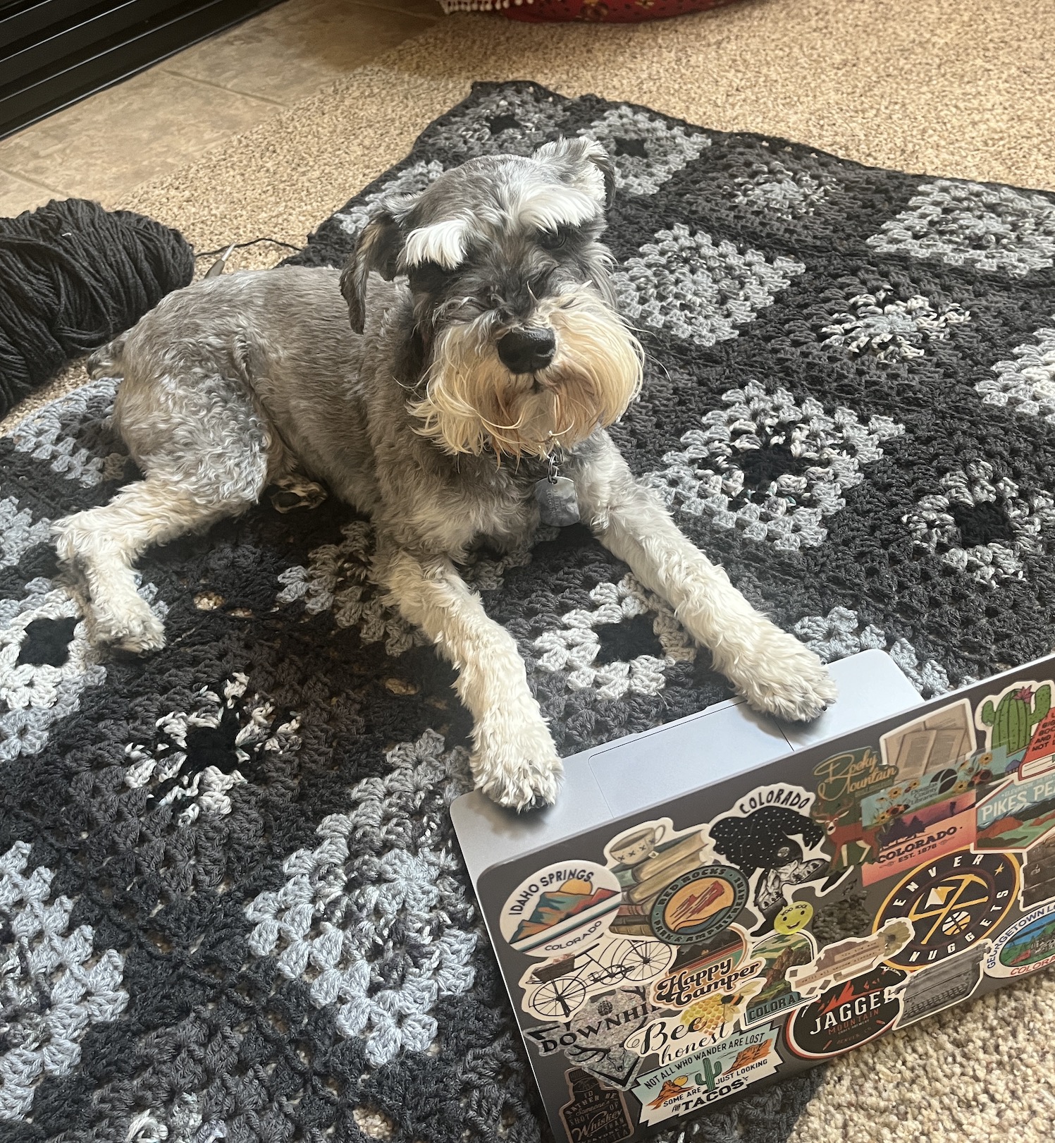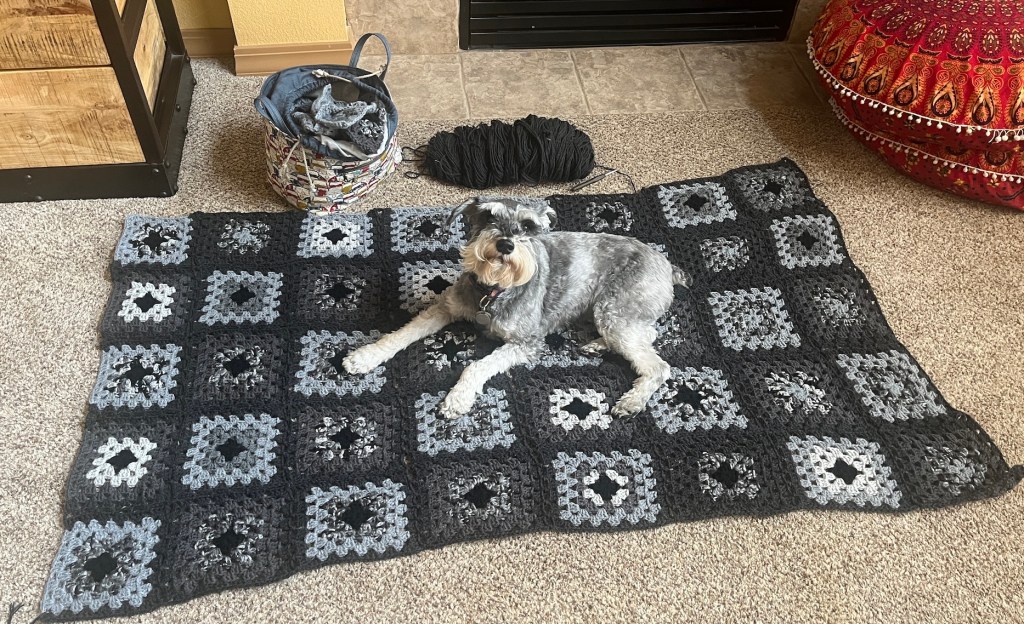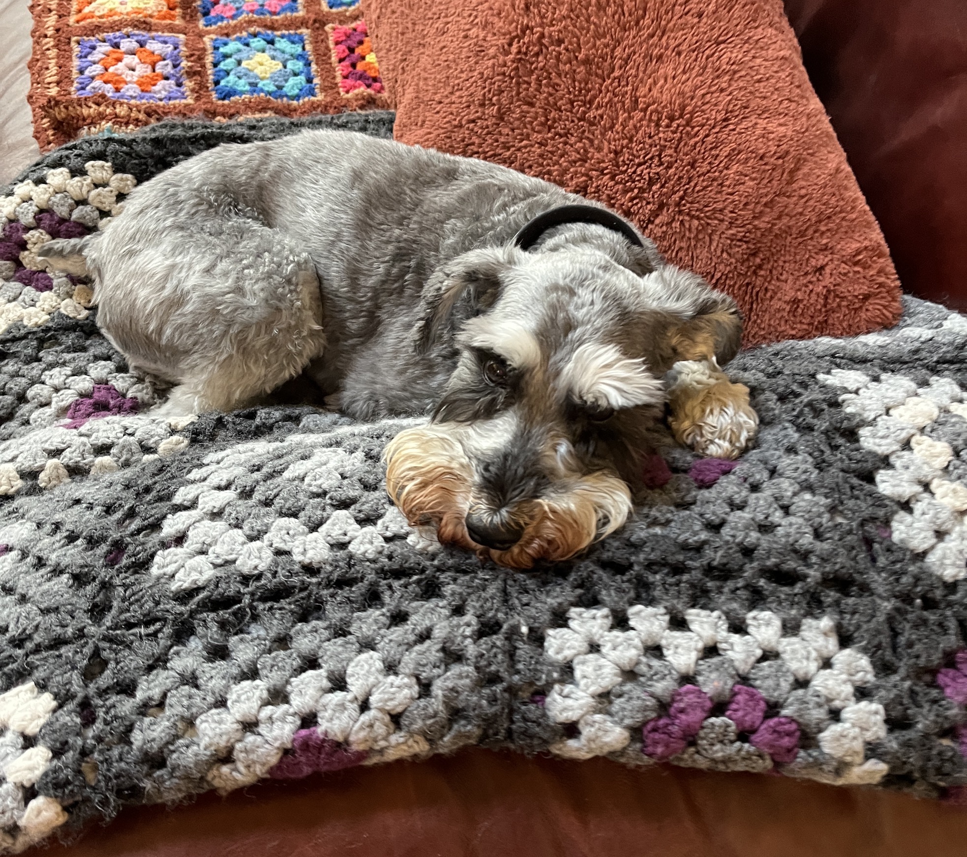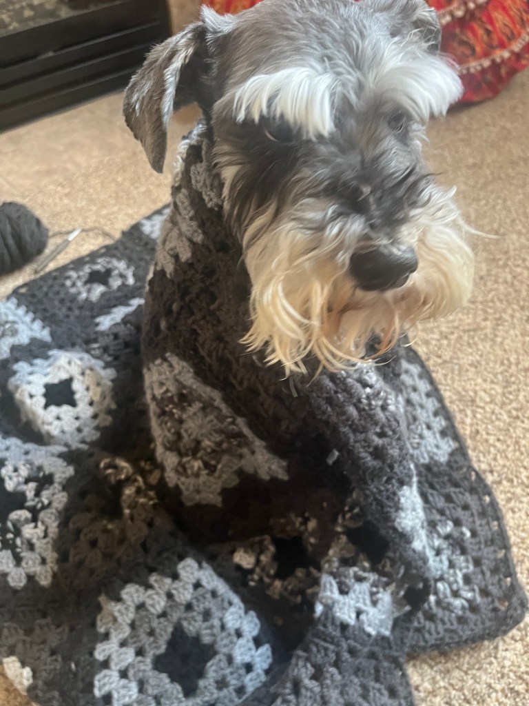 This is Mike, the Miniature Schnauzer that lives with Tierney and John. If you are new to this blog I guest blog post time to time. I want to update you on the gray granny square blanket (MY BLANKET) that Tierney has been working on as I am a little annoyed.