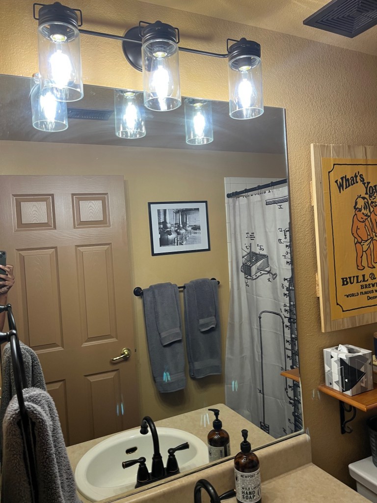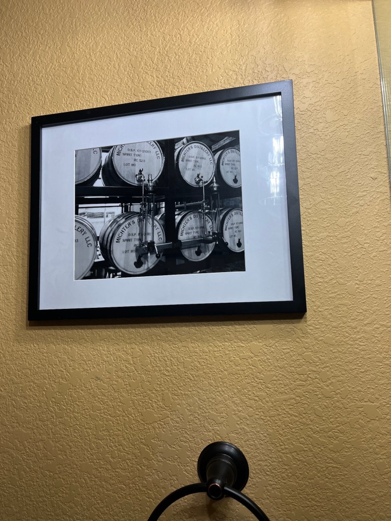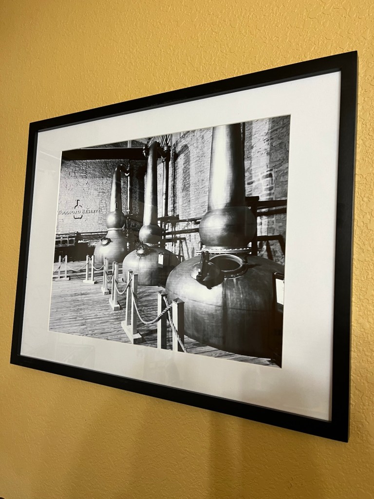 They also took photos that John took in 2019 when he went on a Kentucky Bourbon tour with his friends, converted them to black & white photos, enlarged them, and then framed them as art for the bathroom:
