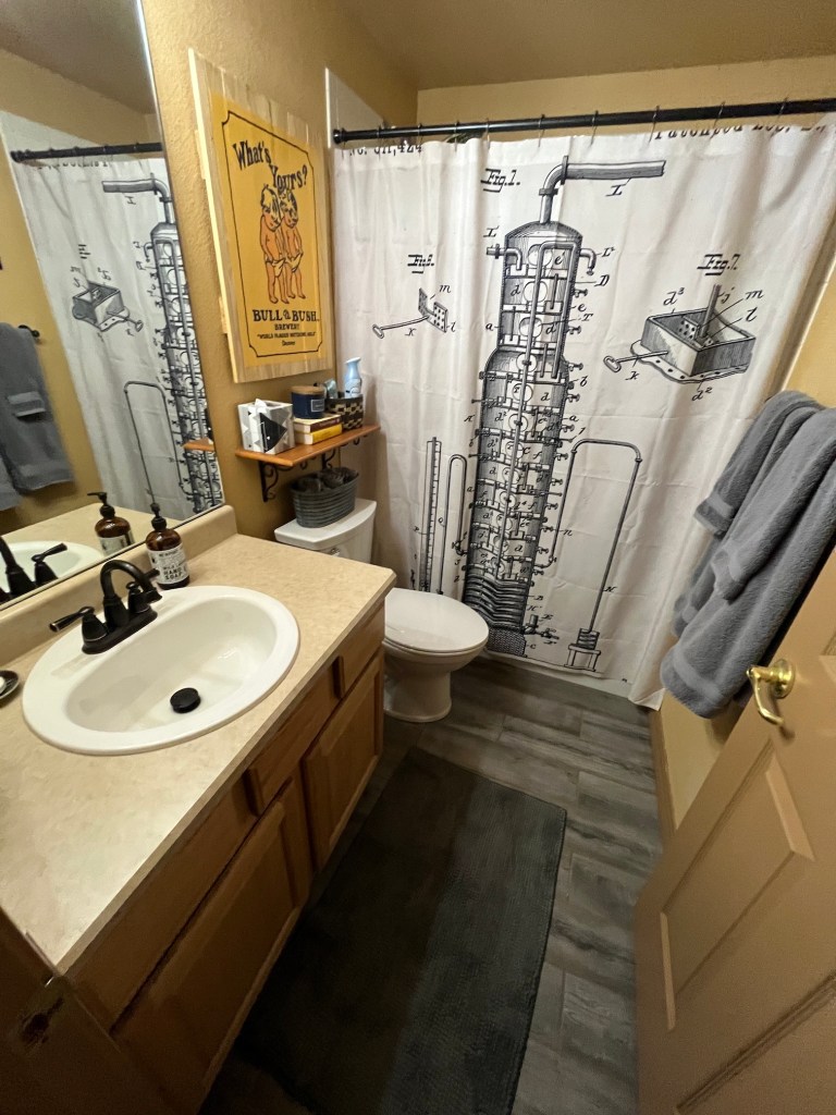 John has his bar near the bathroom and collects nice whiskeys as a hobby, and so they went with a whiskey themed bathroom. The shower curtain according to Tierney is a reproduction of the original “whiskey still” patent (whatever the heck that means, humans are so weird).
