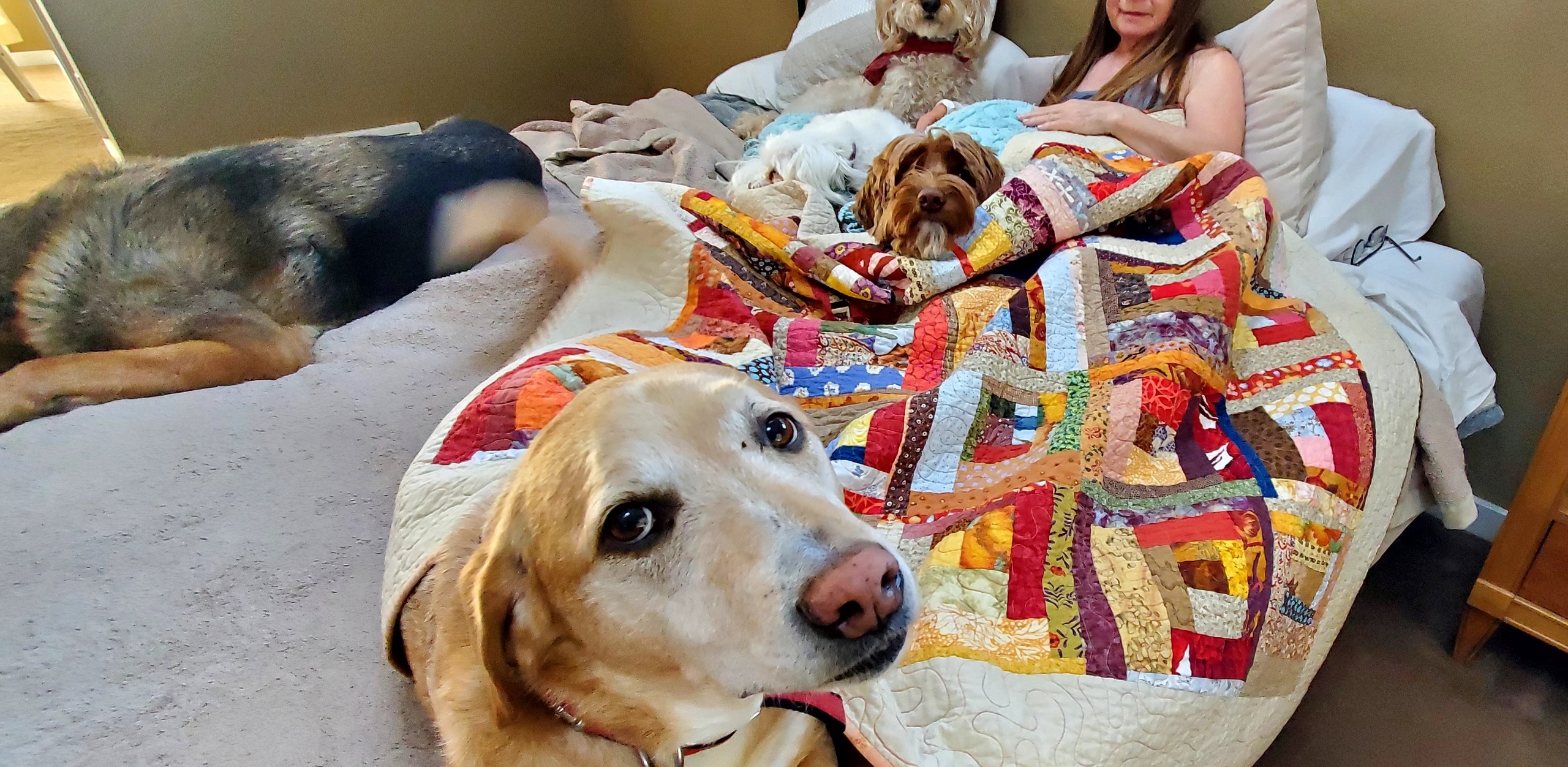 The last day of the project, the humans went out to dinner and then relaxed in the basement den for a movie night. If you look closely at the lower right hand section of the photo below, Tierney is actually working on the quilt she is hand quilting (see her post Hand Quilting Go Boldly) and perhaps sometime this year she will finish it!
