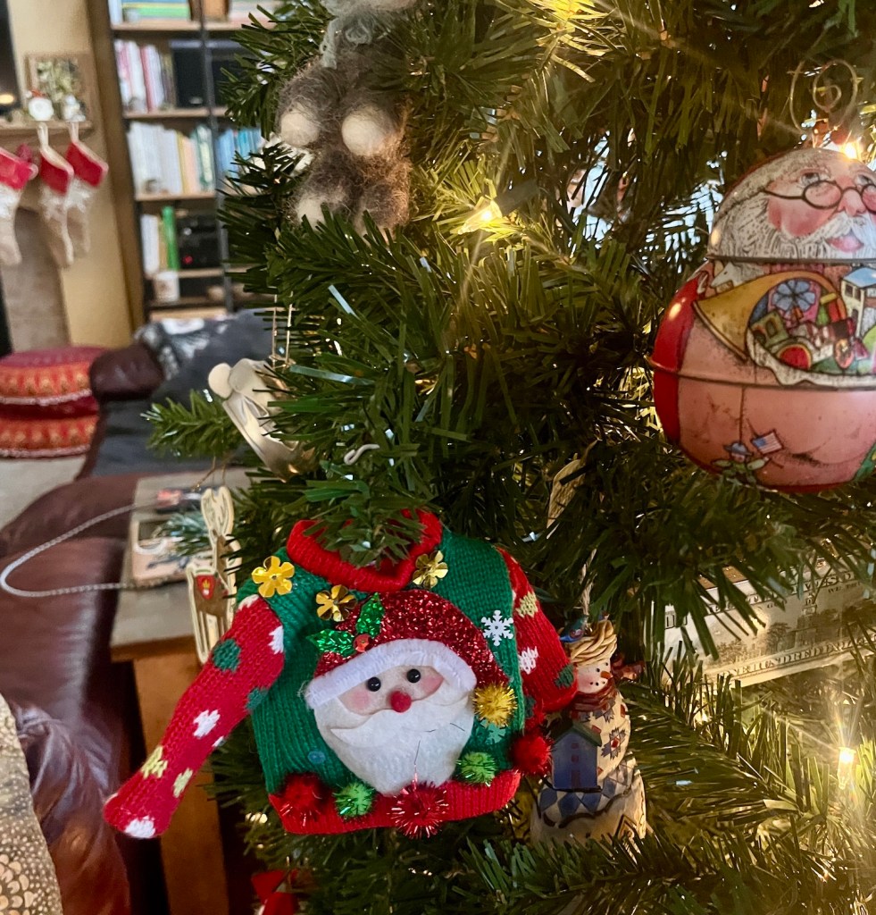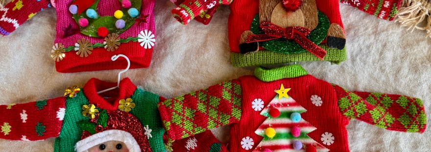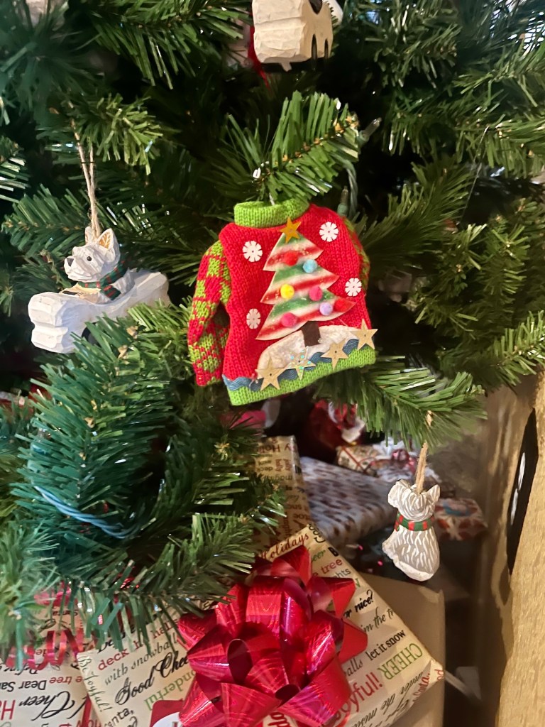 If you are admiring our “Ugly Christmas Sweaters“, Tierney and John (aka “The Humans”) picked them up from Hobby Lobby and they are actually Christmas tree ornaments and hang from little hangers!