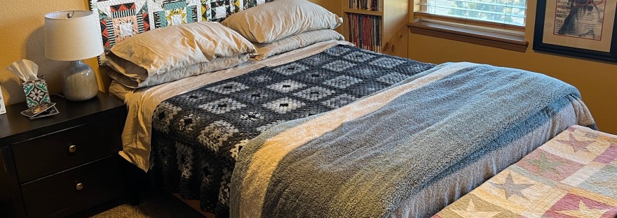 FINALLY in April 2024, Tierney has finish the blanket and has put it on the upstairs guest bed as the warmer weather season covering (though she appears to be confused as it is not officially “warmer weather”, we are just getting warm days here and there):