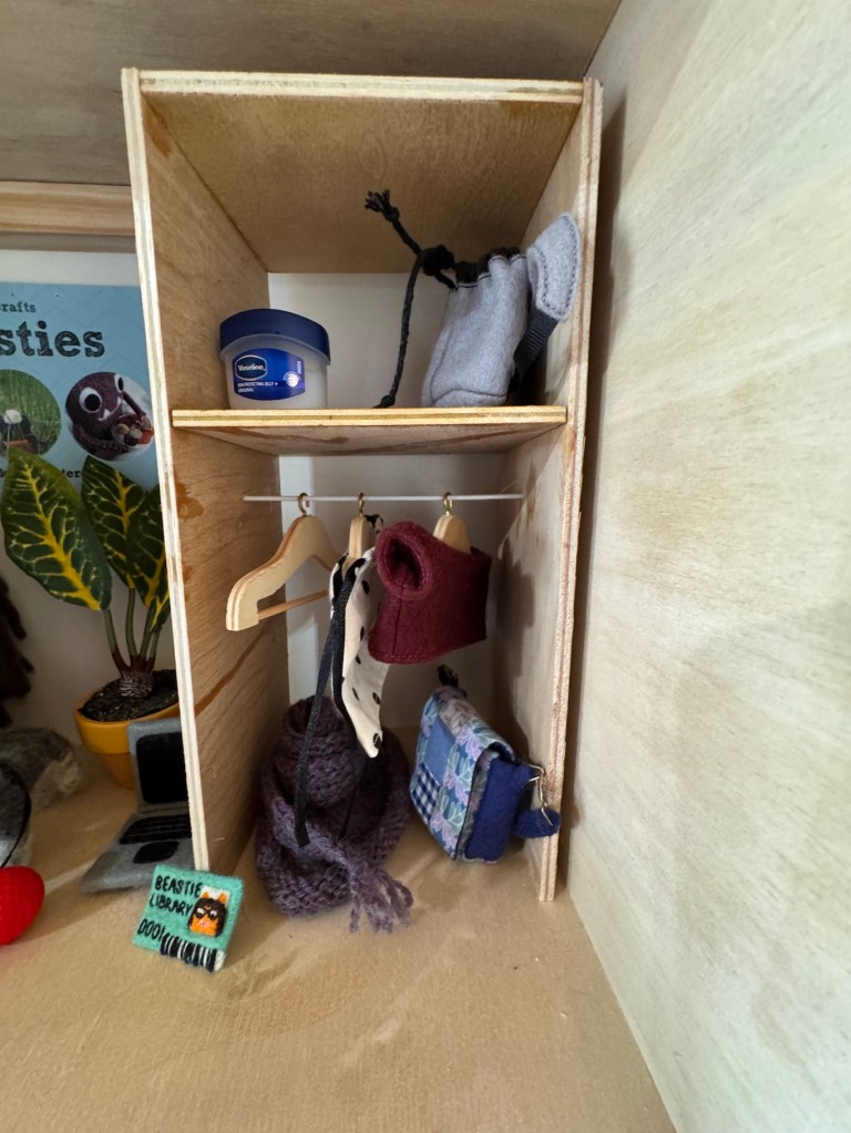 John built me a freestanding closet that can be moved; and Tierney found at gift shop this summer during her travels tiny hangers that she put away hoping someday I would be able to use them! (You might be curious about the container of Vaseline on the top shelf of my closet – Human Tierney and John also found that traveling this summer and thought it was very cute – a Beastie sized personal care product!)