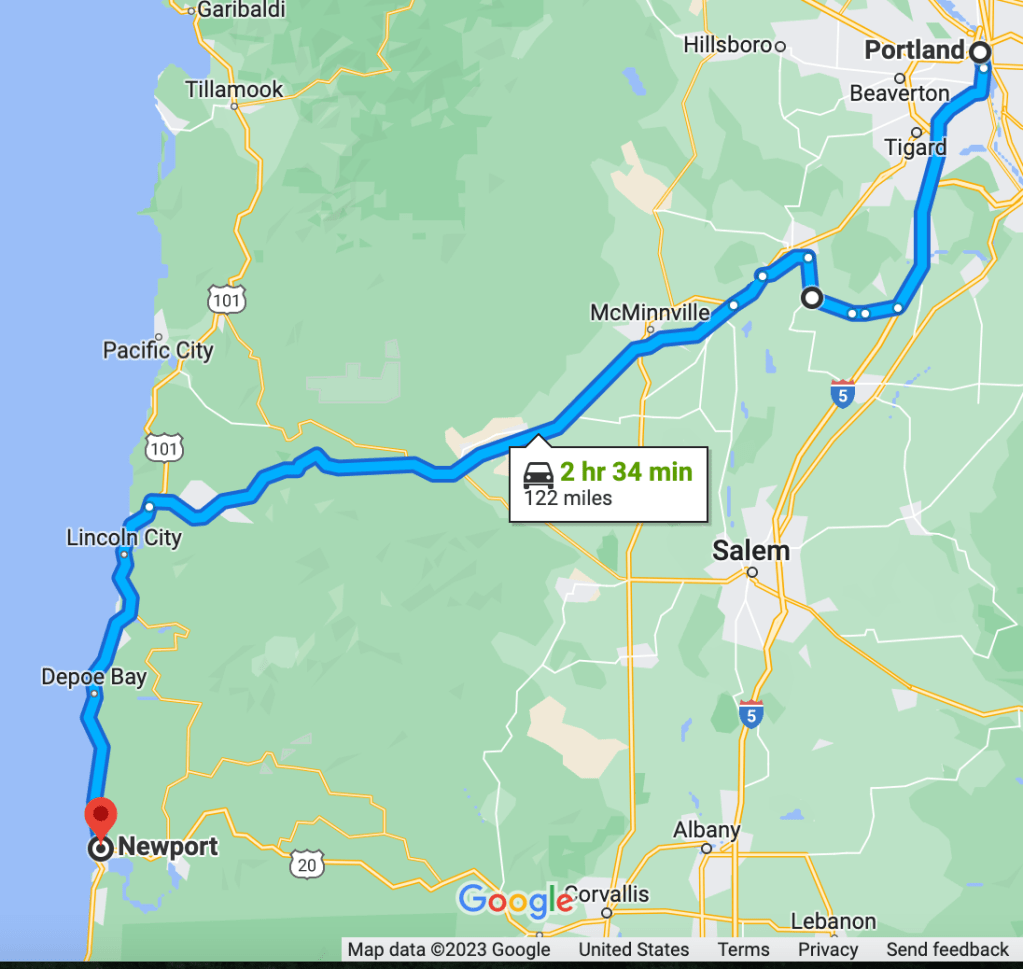 The plan was meet up with our friends in Newport, Oregonon the Oregon Coast the next day after flying into Portland, Oregon. We rented a car and here was our travel route (with lots of beauty along the way to see on the Pacific Coast Highway/Highway 101):