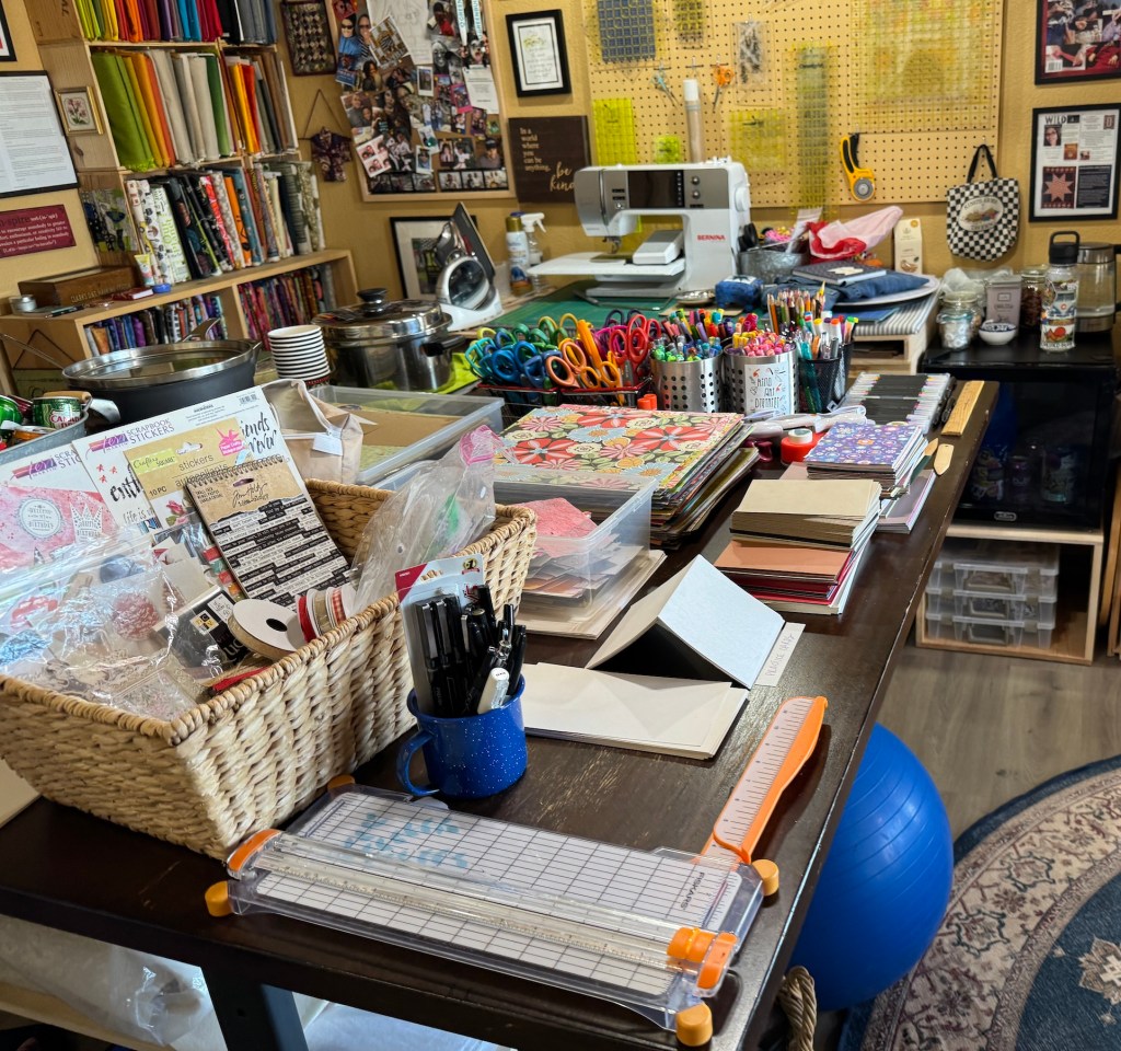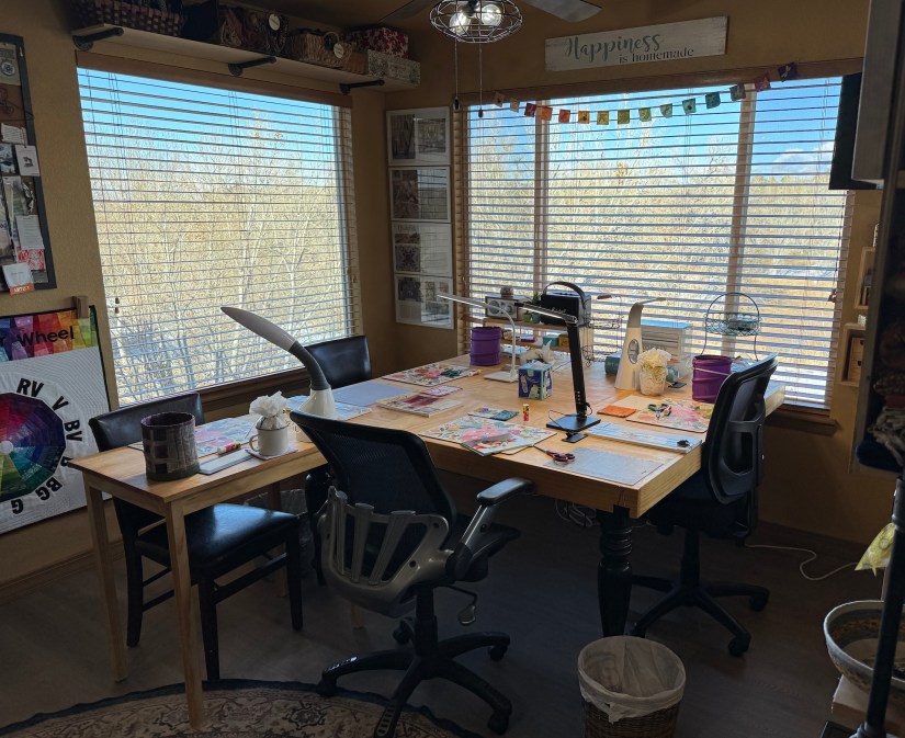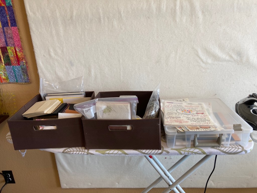 I converted my studio/sewing room into a “paper crafting emporium” for the day, putting away my sewing machine and current project in progress (which I will share in a future post) and dusted off my old paper crafting supplies and set them up around the room.