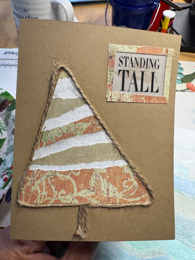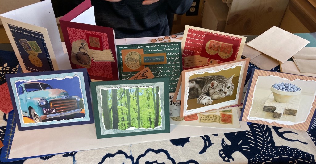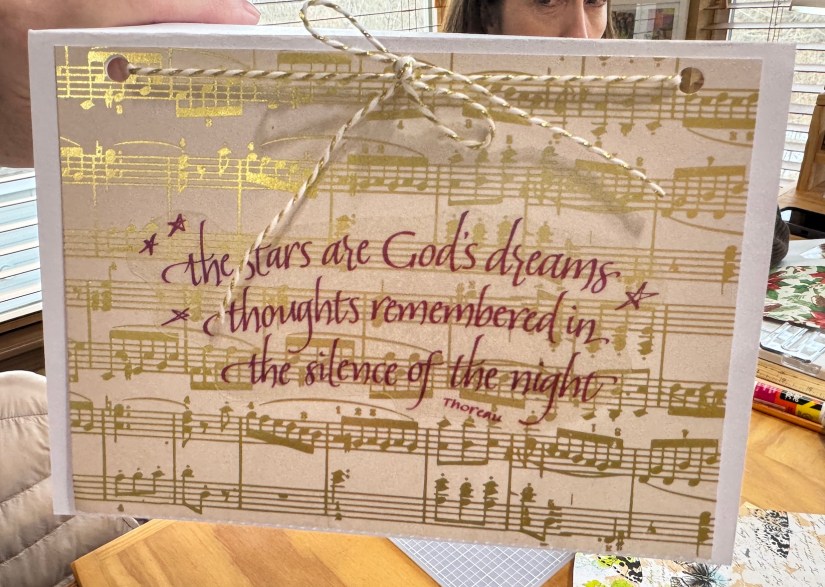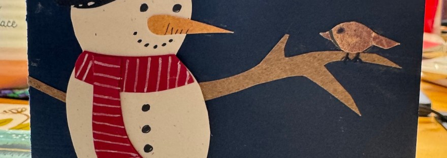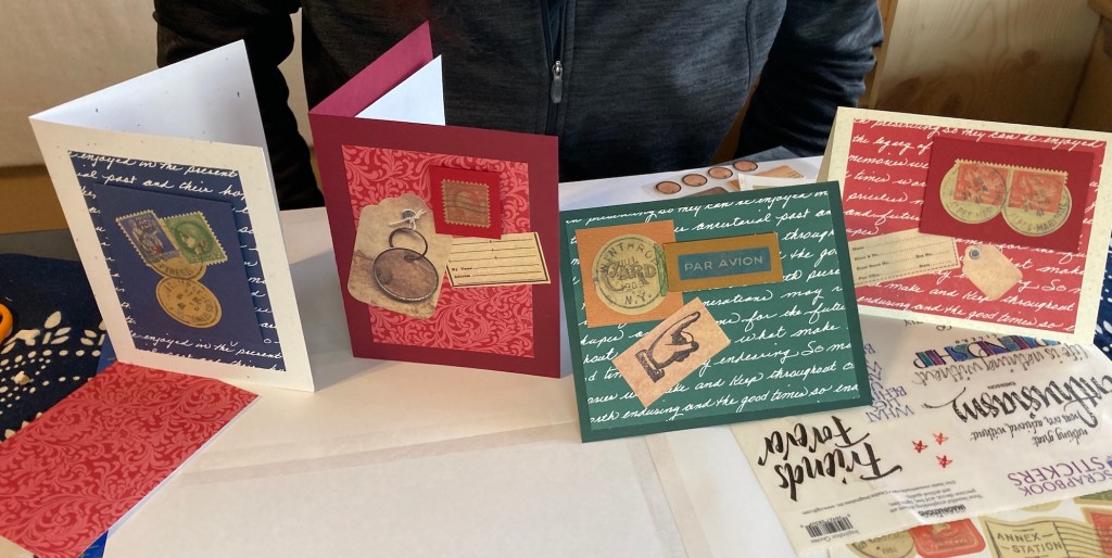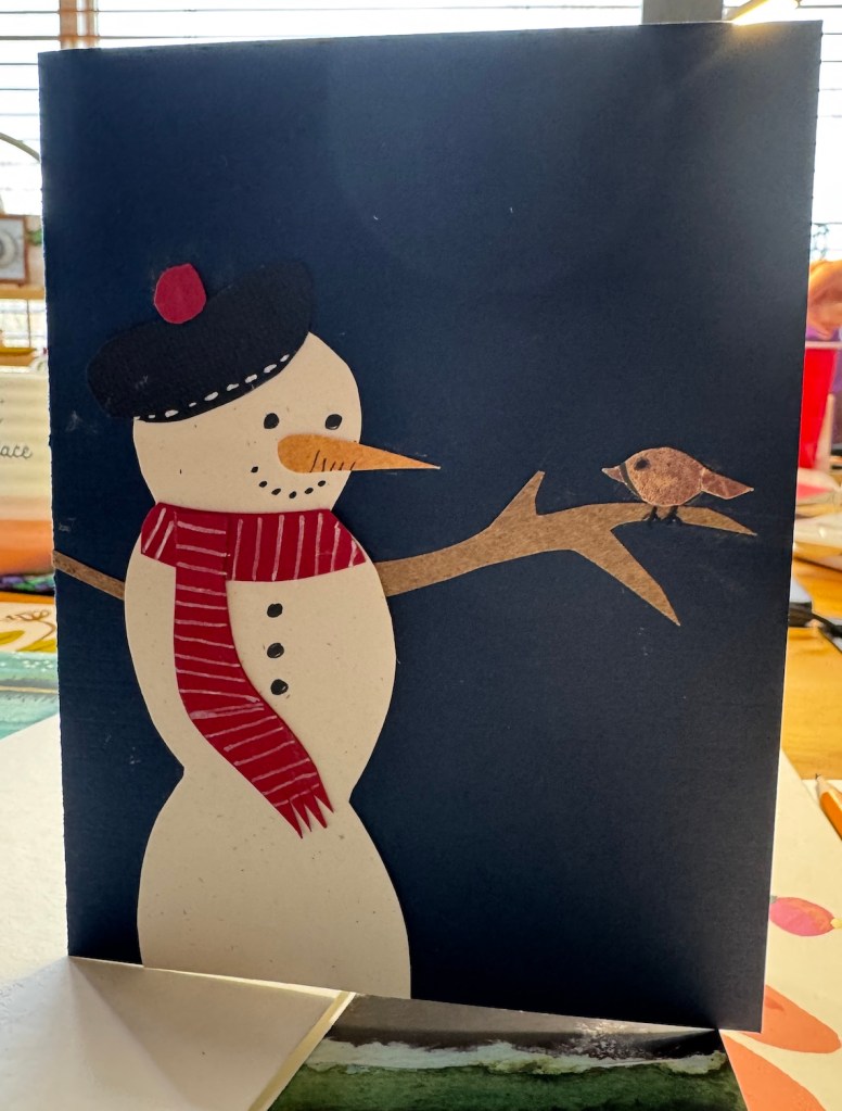 There was an art quilter in the group so you might be able to pick out some of her cards! The snowman was made by my friend who is a retired 1st grade and Kindergarten teacher – she simply looked at an image on her phone and cut out the snowman from paper scraps, and then embellishing it with paint pens!