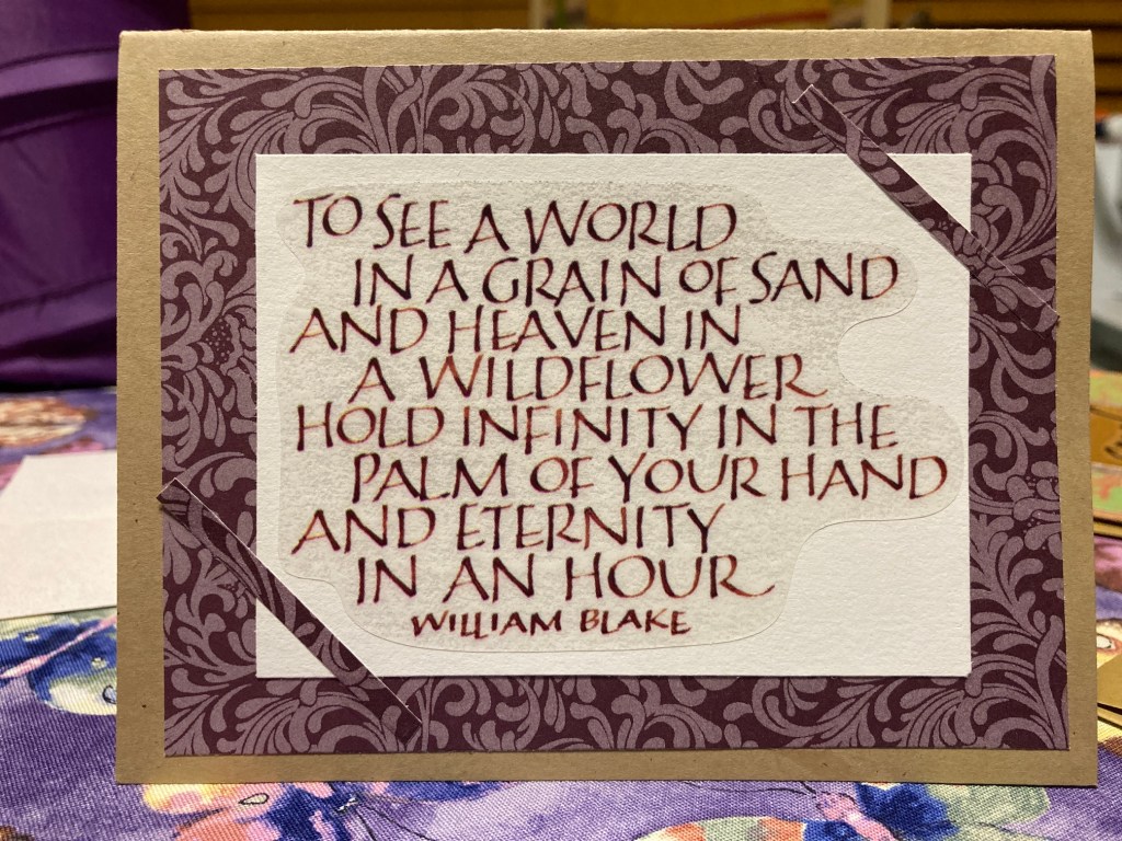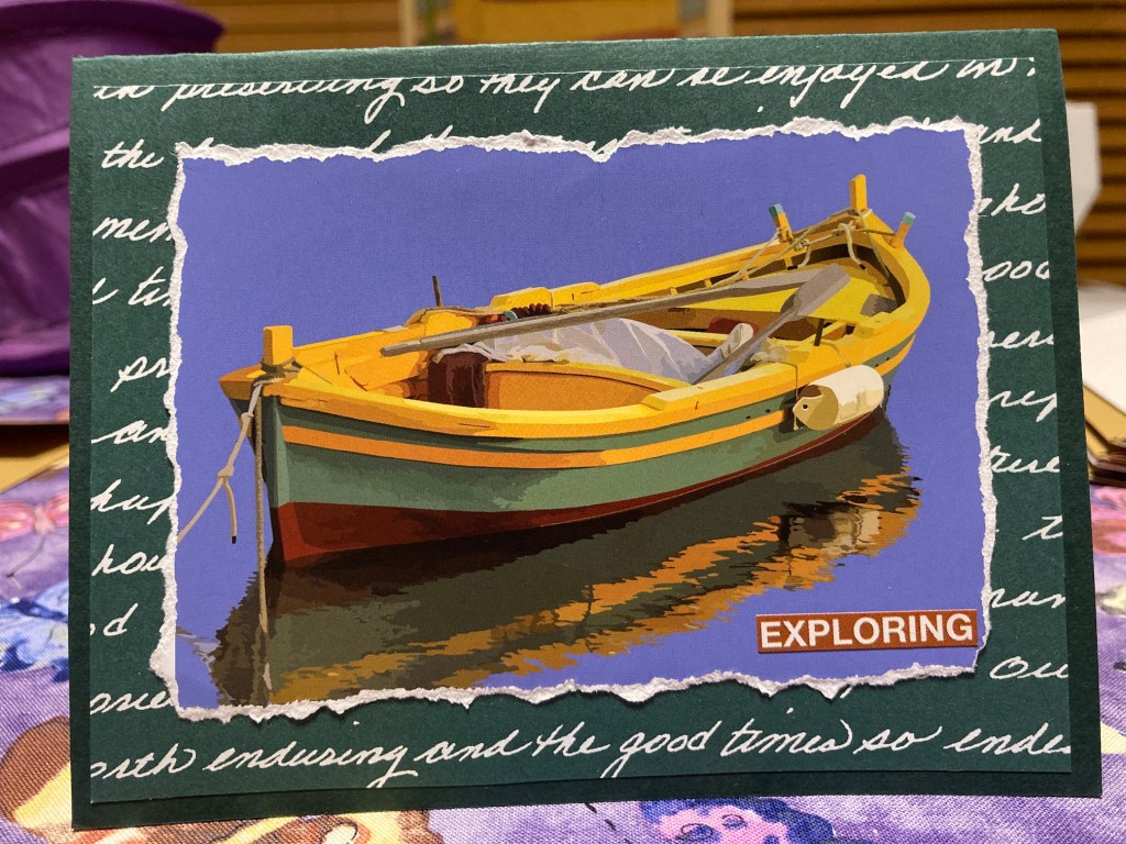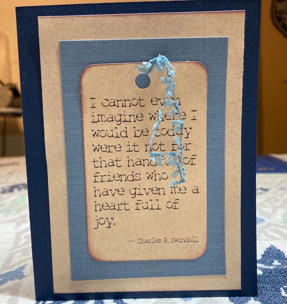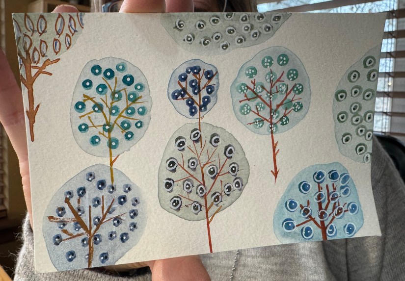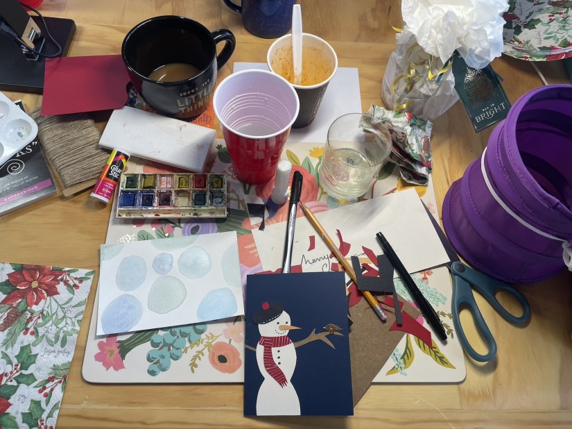 There was an art quilter in the group so you might be able to pick out some of her cards! The snowman was made by my friend who is a retired 1st grade and Kindergarten teacher – she simply looked at an image on her phone and cut out the snowman from paper scraps, and then embellishing it with paint pens!