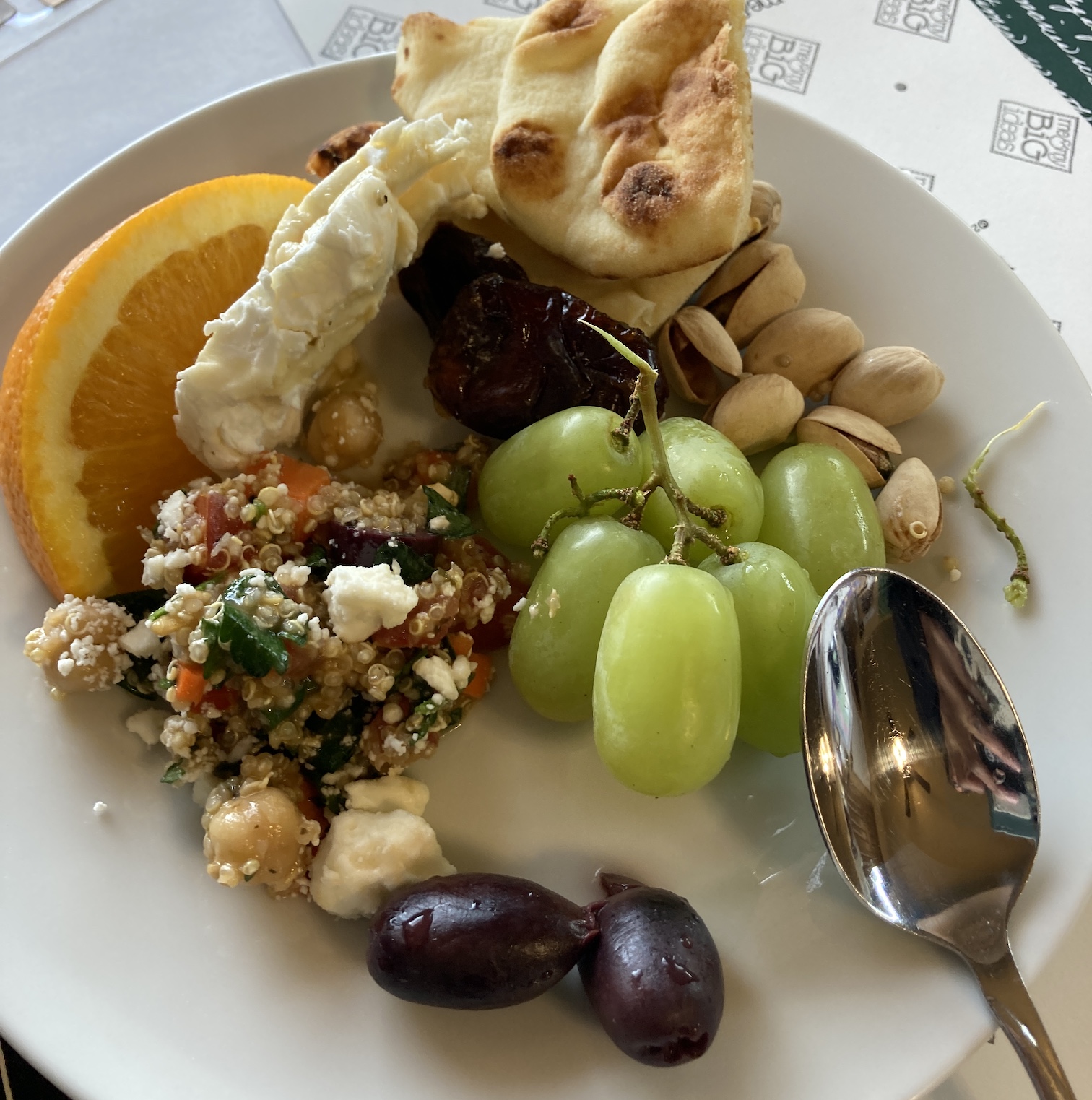 Since the City of Brass takes place in the 18th century Middle East, I made a Middle Eastern themed lunch for us of tabouli, hummus, fruits, pistachios, dates and goat cheese drizzled with honey, and pita bread: