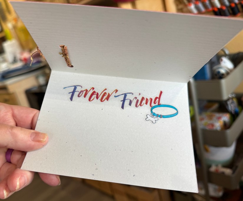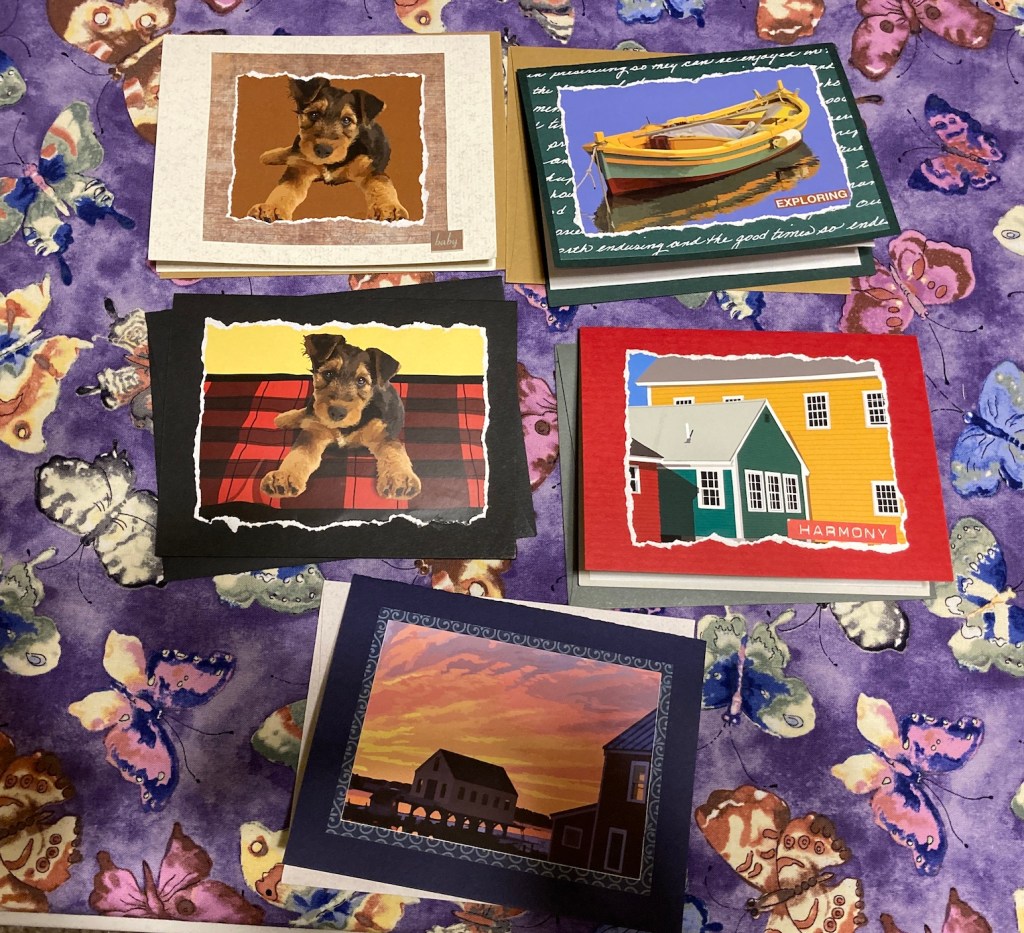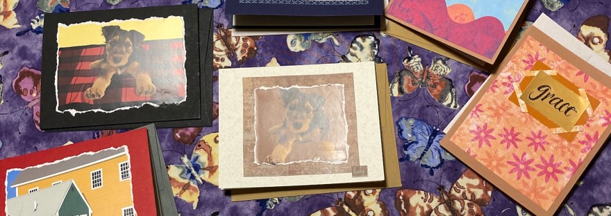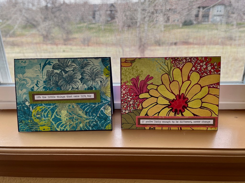 I tried to recreate the style of the cards I made previously for my Etsy shop that I featured earlier in the post but I was struggling with my paper cutter (old dull blade, etc.) in order to make larger cards from card stock, so I settled on using pre-made and folded smaller card stock I found in my paper crafting stash (likely 15+ year old!).