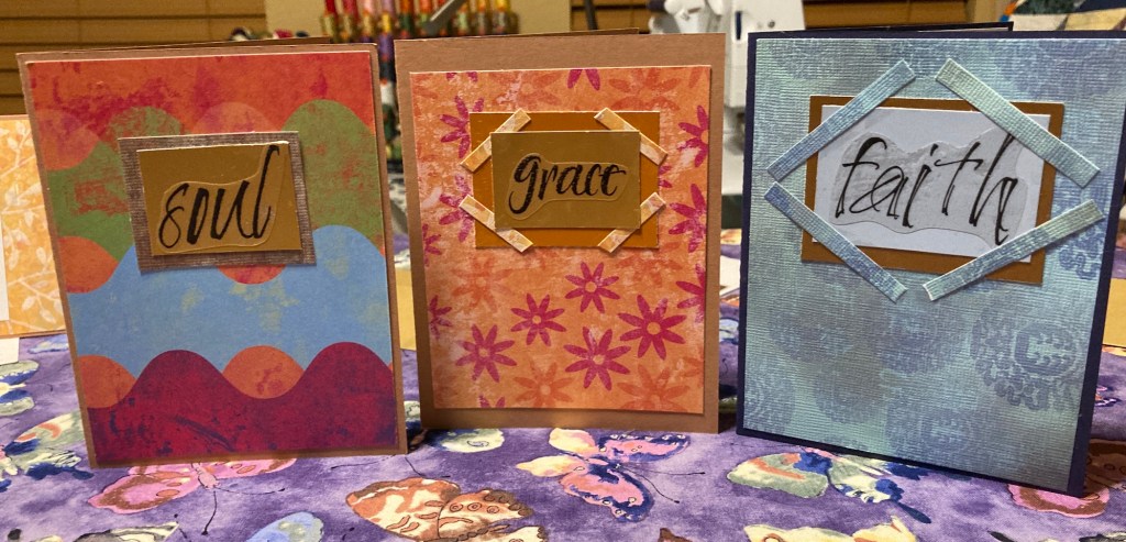 Since I needed to make 8 cards and wanted to get back to my 100 Block Sampler I am working on as not to lose momentum (see post “Sewing-Block” Resolved by Sewing a Block!), I thought a quick way to make cards would be using old scrapbook papers.