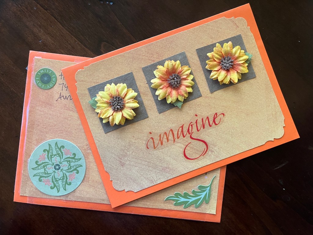 I have a penpal and we’ve been exchanging letters/cards. She makes beautiful handmade cards and it was time I made her a handmade card. I pulled out my dusty papercrafting/card making supplies and made one that is an ode to Sunflowers my favorite flower!