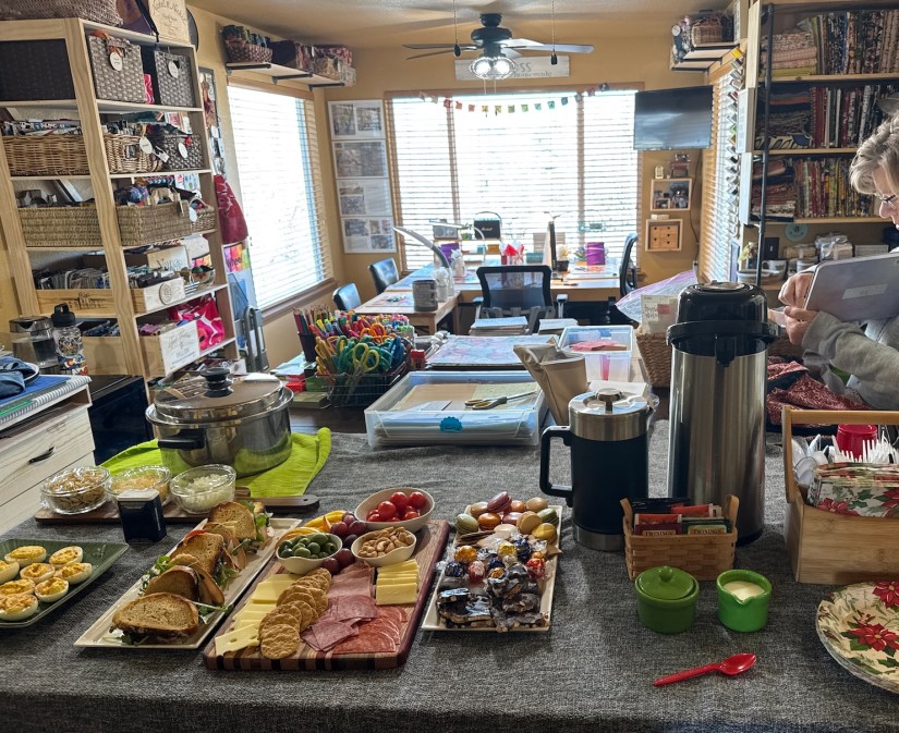 I converted my studio table (putting away the cutting mats, rotary cutters, pins, etc.) into a card making supply station and the lunch buffet station: