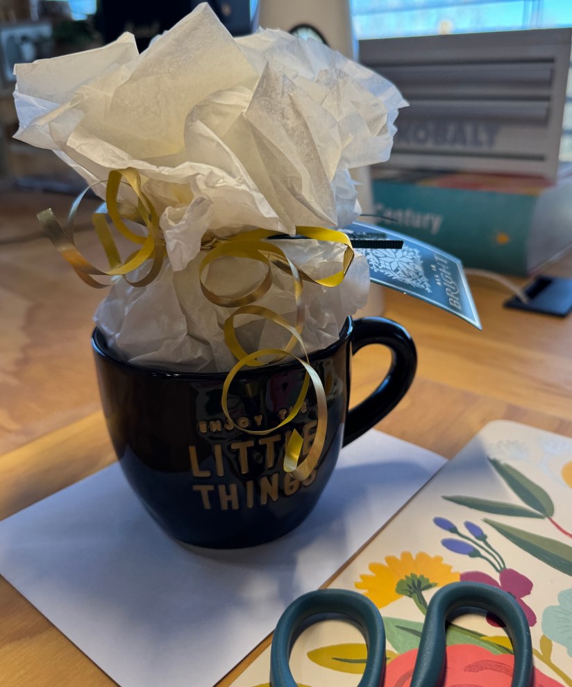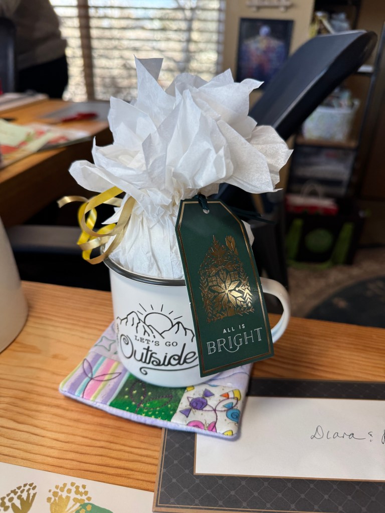 I set up a “crafting placemat” (some pretty hard-sided Rifle Paper Co. placemats I found thrifting) at each crafter’s station, along with their own light and some basic supplies (scissors, glue stick, etc.). I also included a little holiday gift for them – a mug for their coffee//tea filled with goodies.