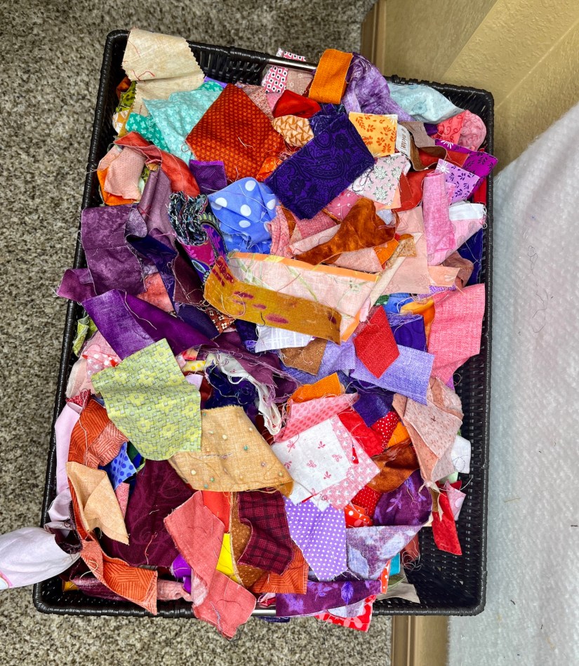 I helped J find some type of inspiration fabric scrap in the pile that had a color palette (as how else to you start sifting through that “hot mess” to design a scrap quilt?). Once she found an inspirational scrap, she started pulling from the scrap pile fabric scraps that coordinated with the scrap to create a palette.