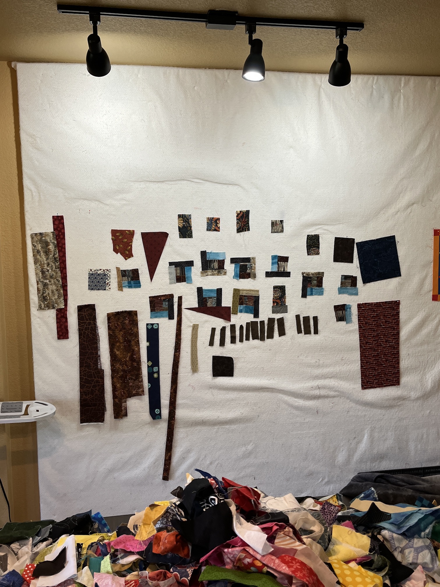 But first I will share the huge fabric scrap pile J and I had to work with during the 5 days in August we had the retreat: it was a combination of my scrap pile and scraps that J brought: