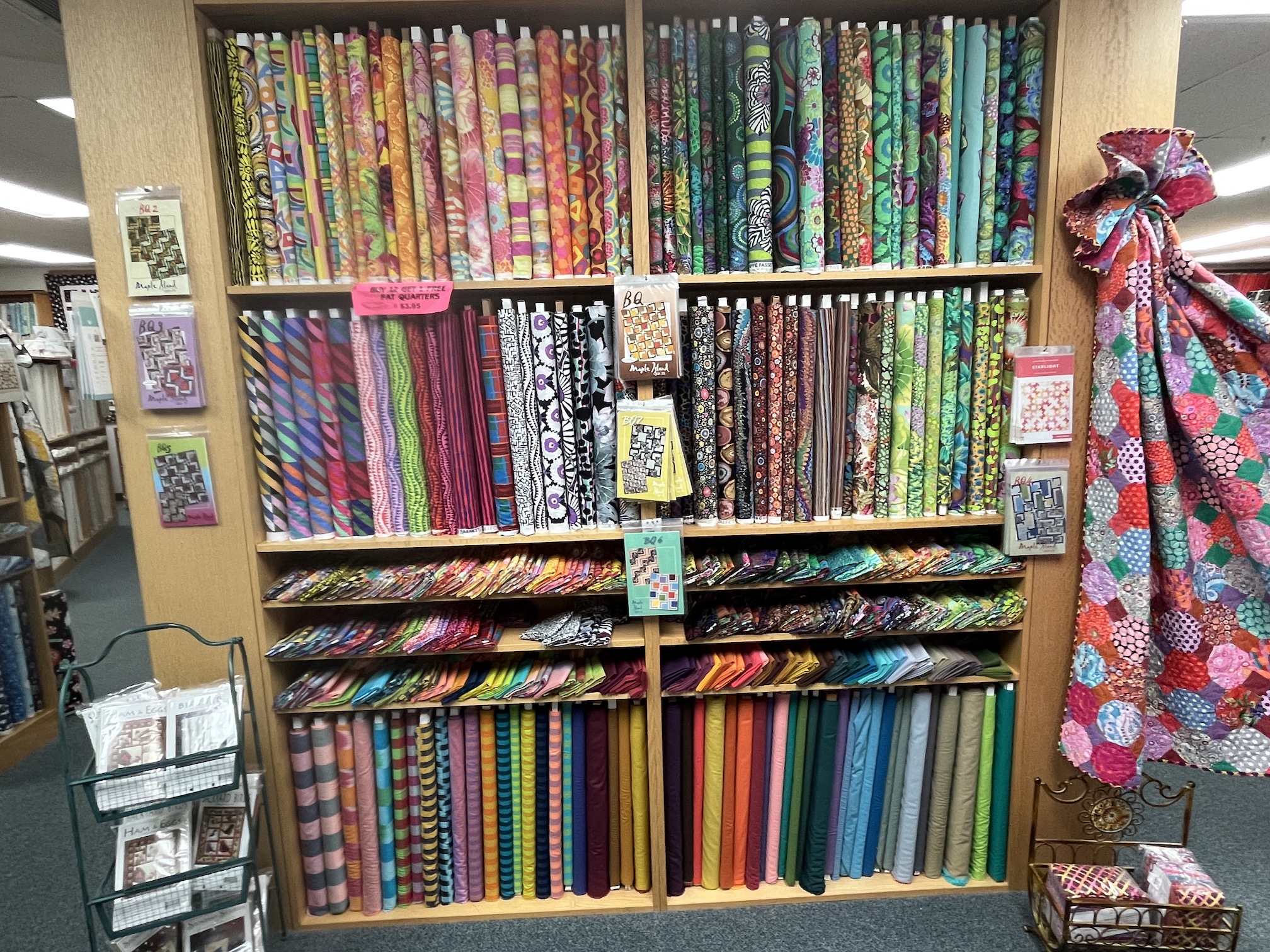 One day I did take J to a quilt shop – we visited Holly’s Cabin quilt shop and J was amazing by their extensive collection of curated Kaffe Fassett fabrics on display: