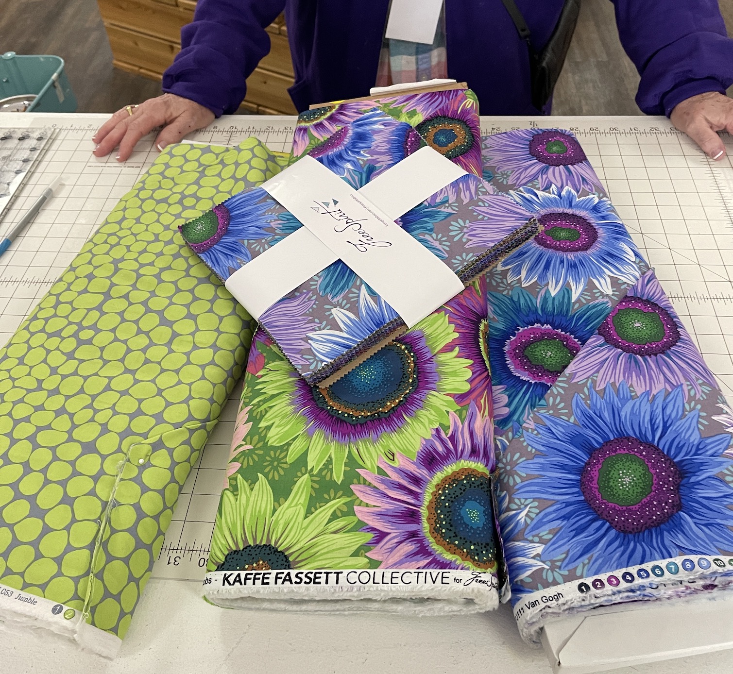 Mike does look like he is concerned about some of our fabric choices (or perhaps the damage some of us were inflicting on our pocketbooks!)