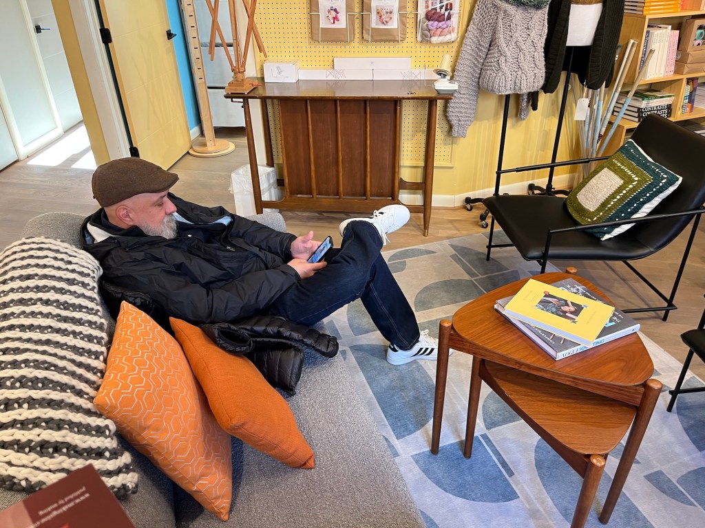 Upstairs they have their classroom, more yarn (because I guess there just wasn’t enough on the first floor), and a sitting area for non fiber art aficionados (I put John there and he had a relaxing wait while I browsed):