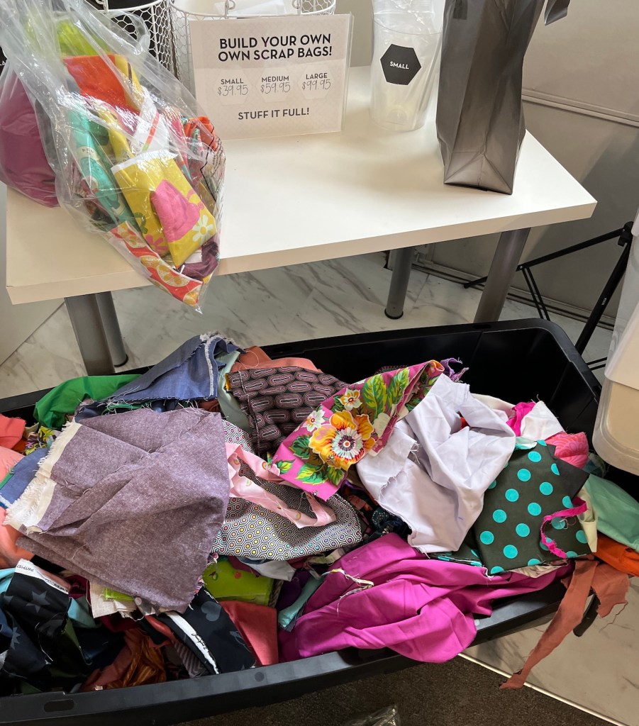 I found a couple items at the shop – some Art Gallery Fabrics for 1/2 off in their clearance rack and then this – a bin of FREE fabric scraps where customers could take whatever they wanted: