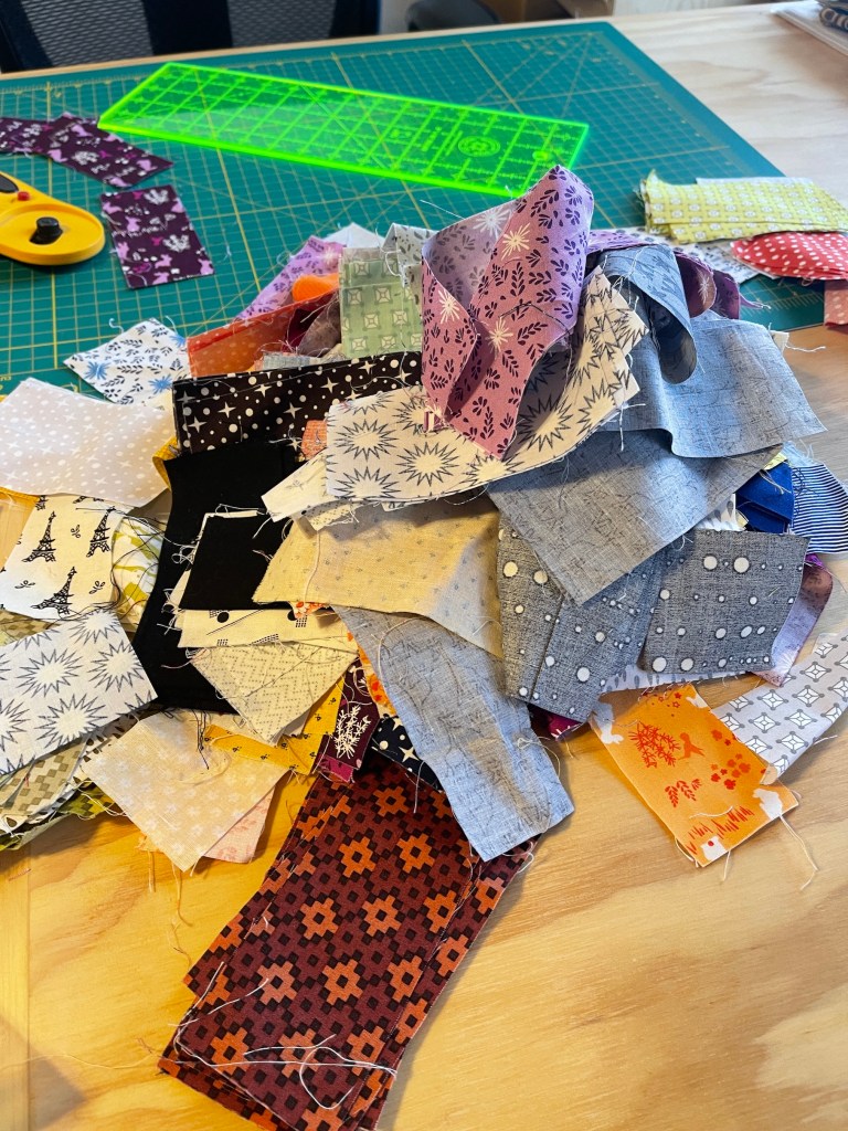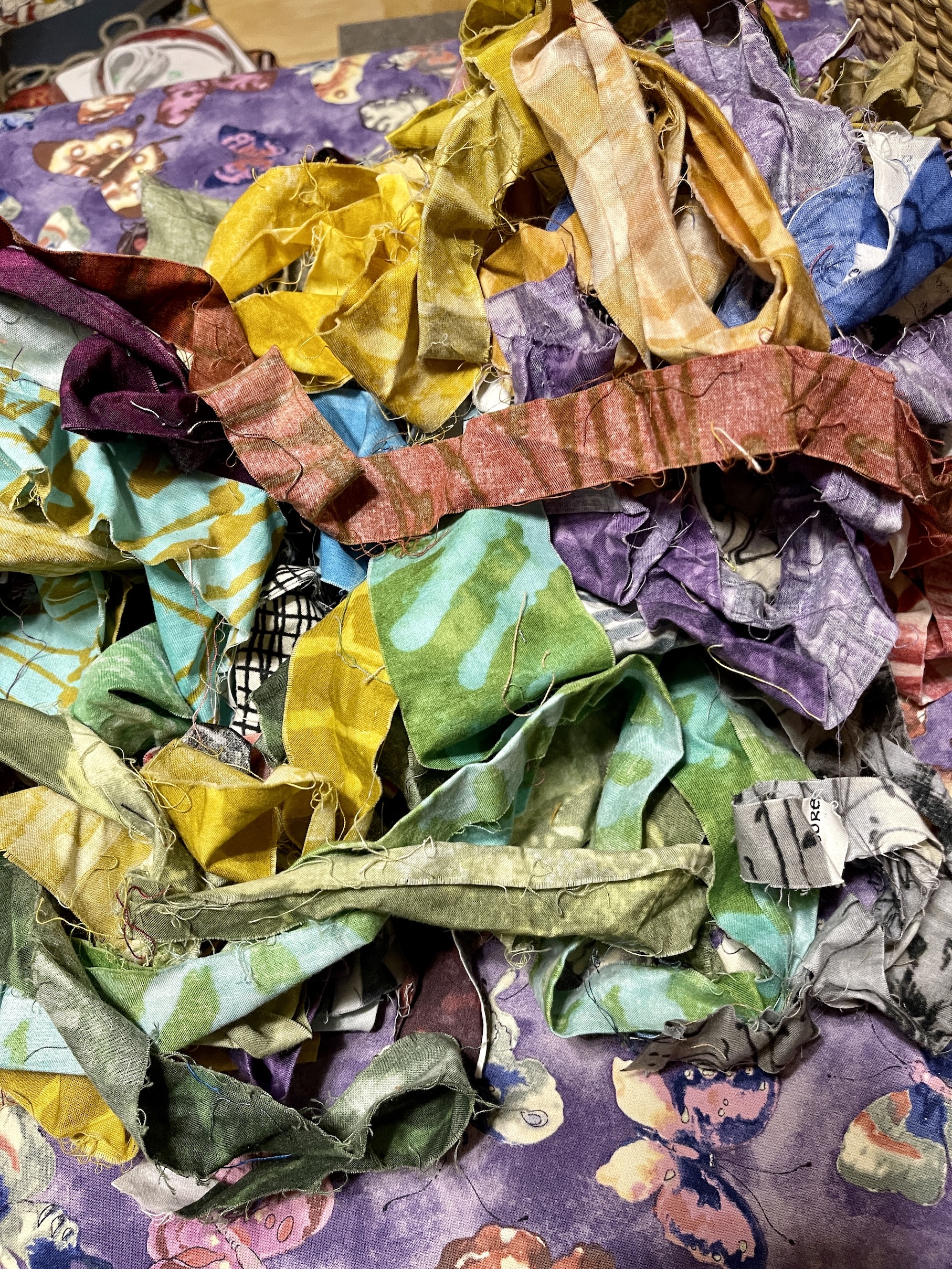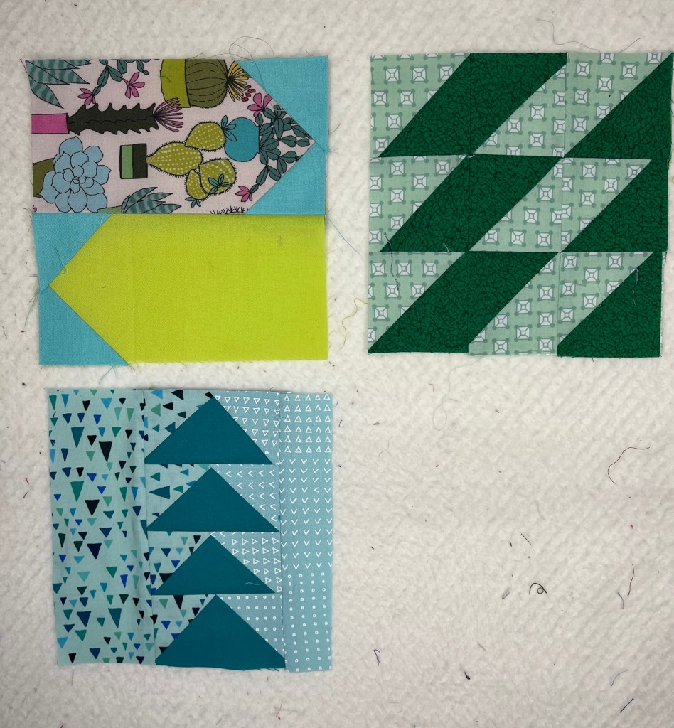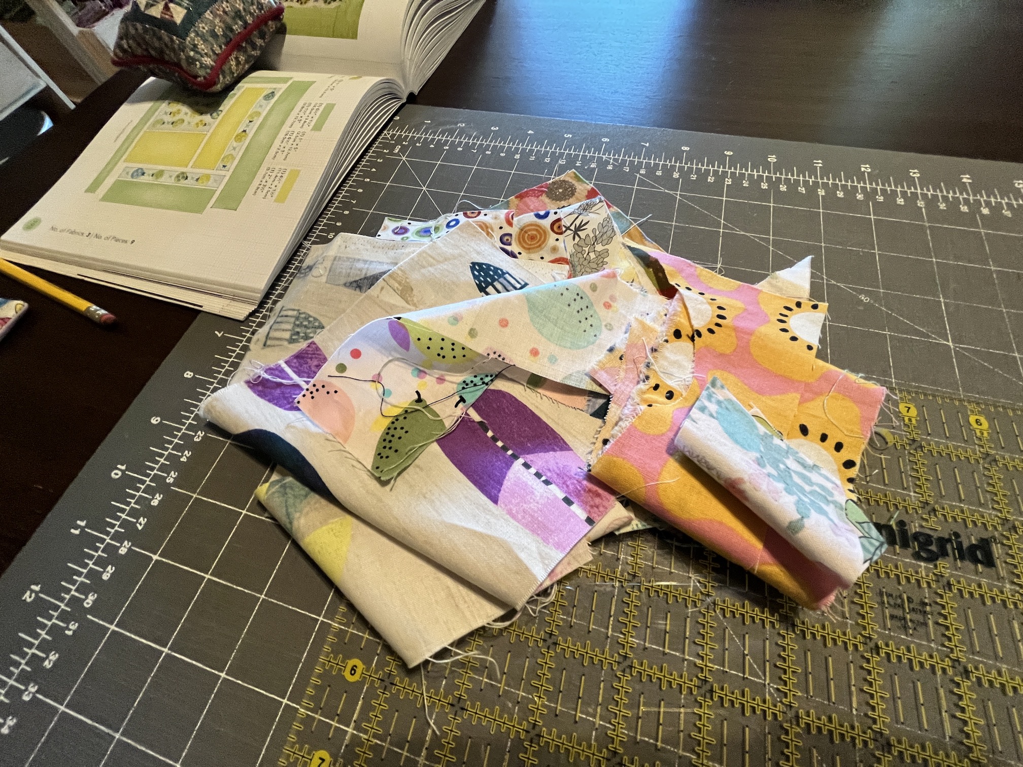 Currently I am piecing together the backing with a collection of teal/blue-green yardages I have: