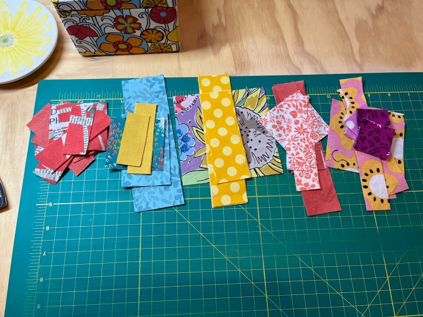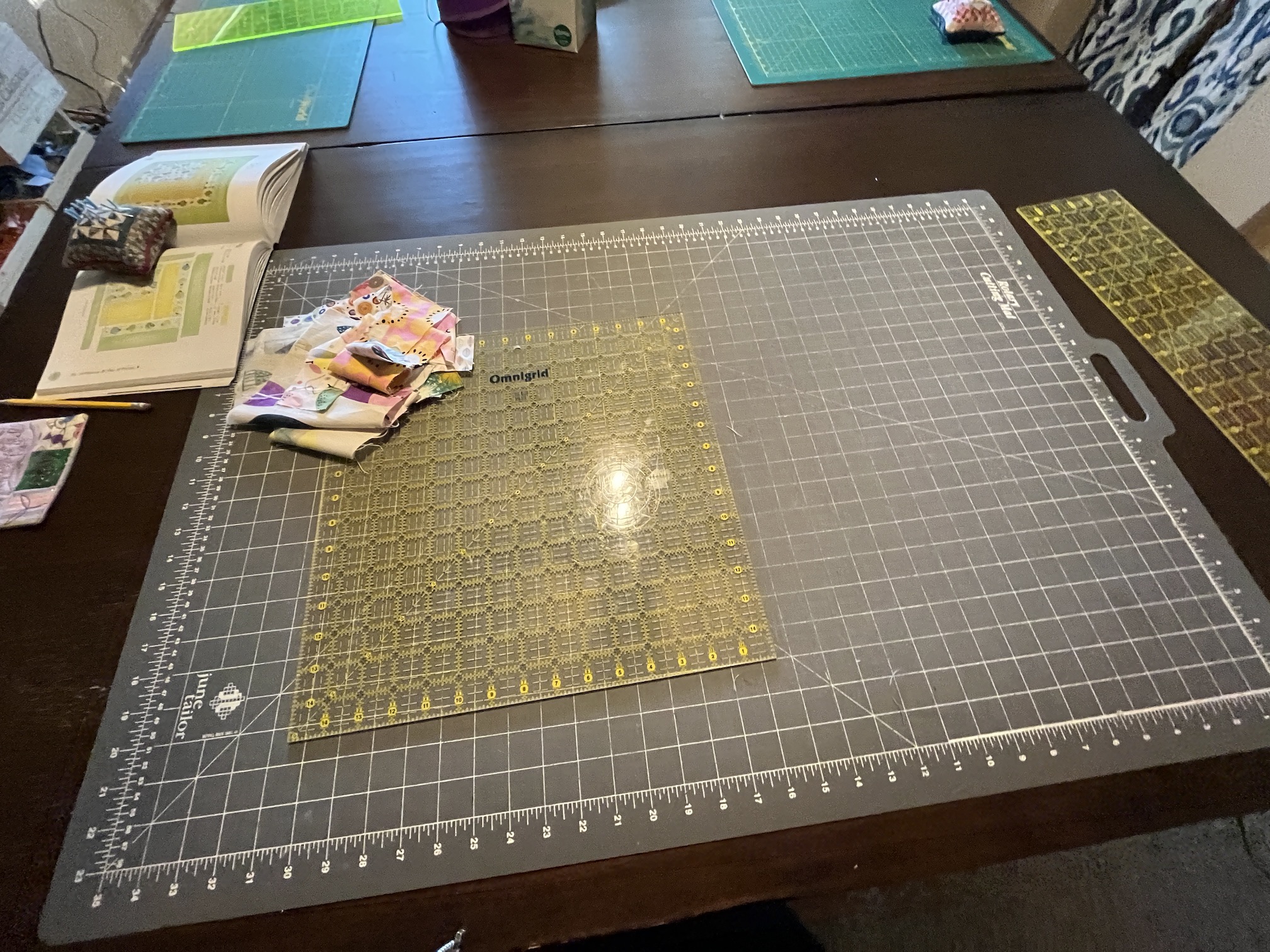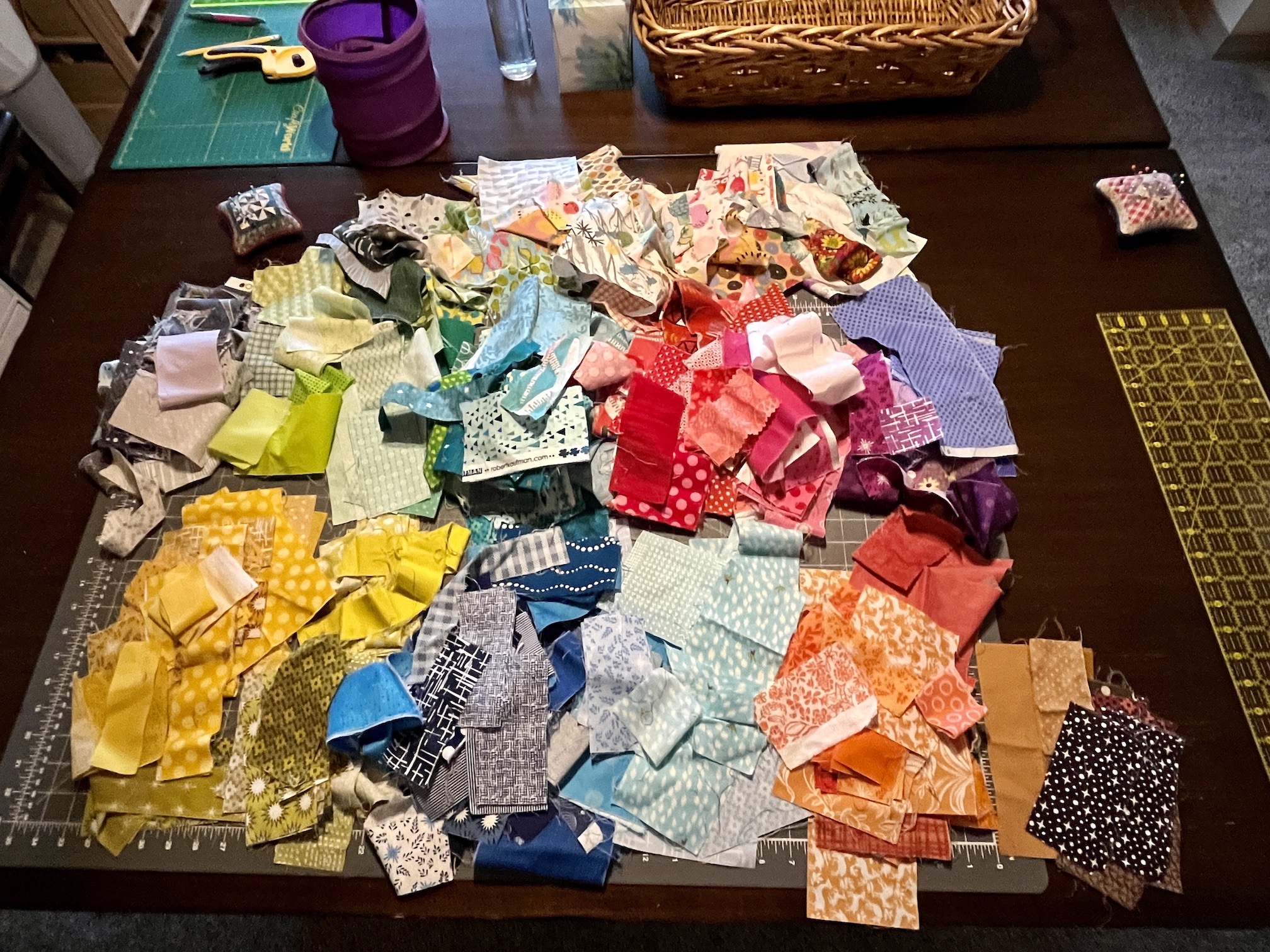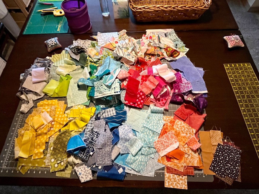 Currently I am piecing together the backing with a collection of teal/blue-green yardages I have: