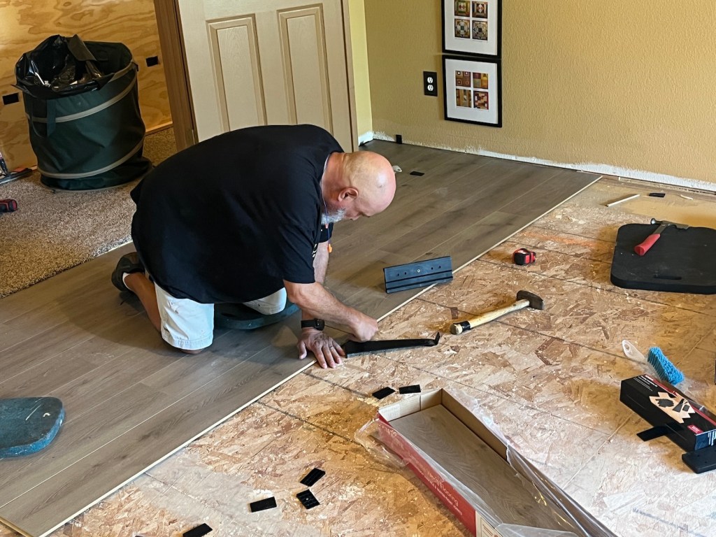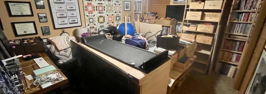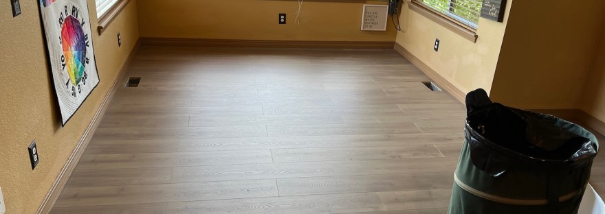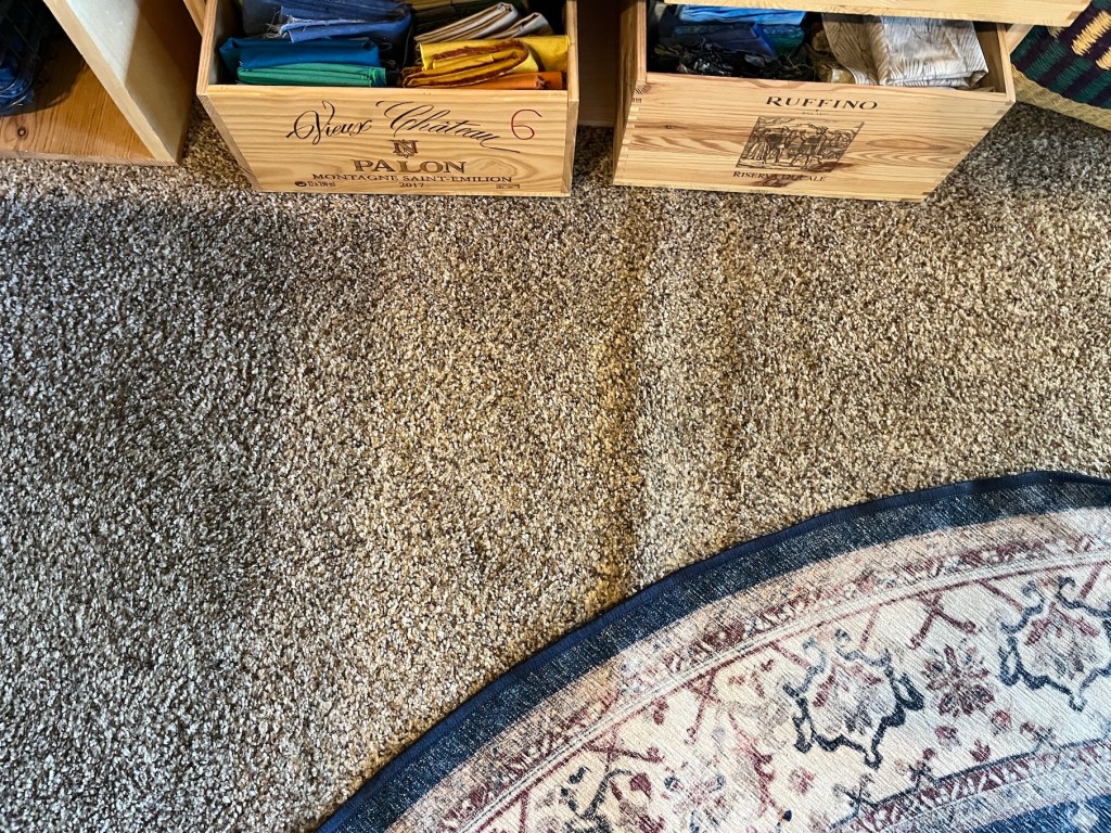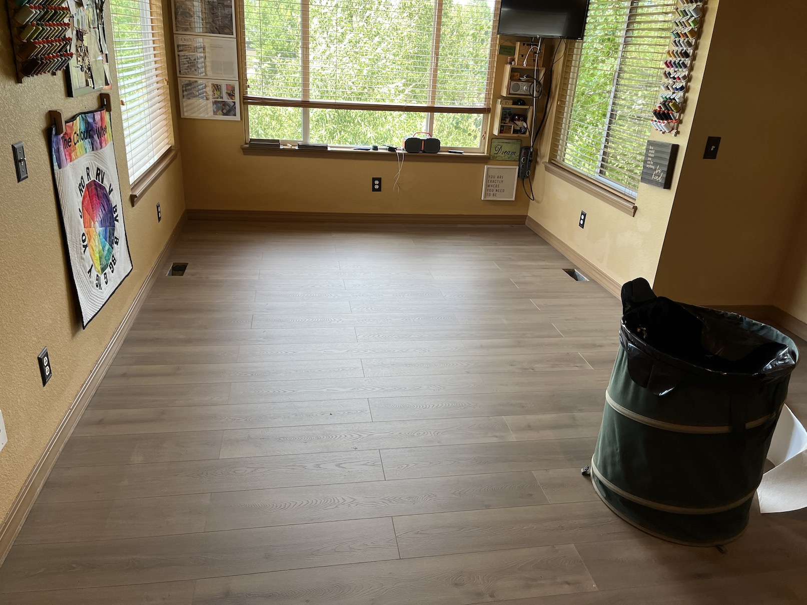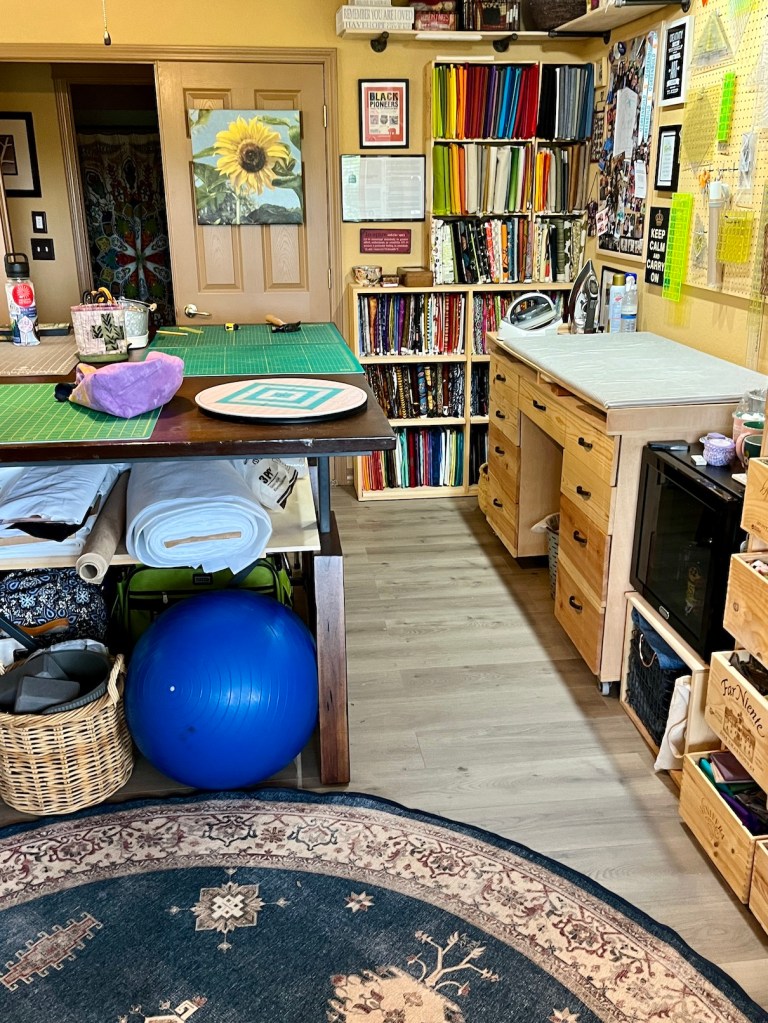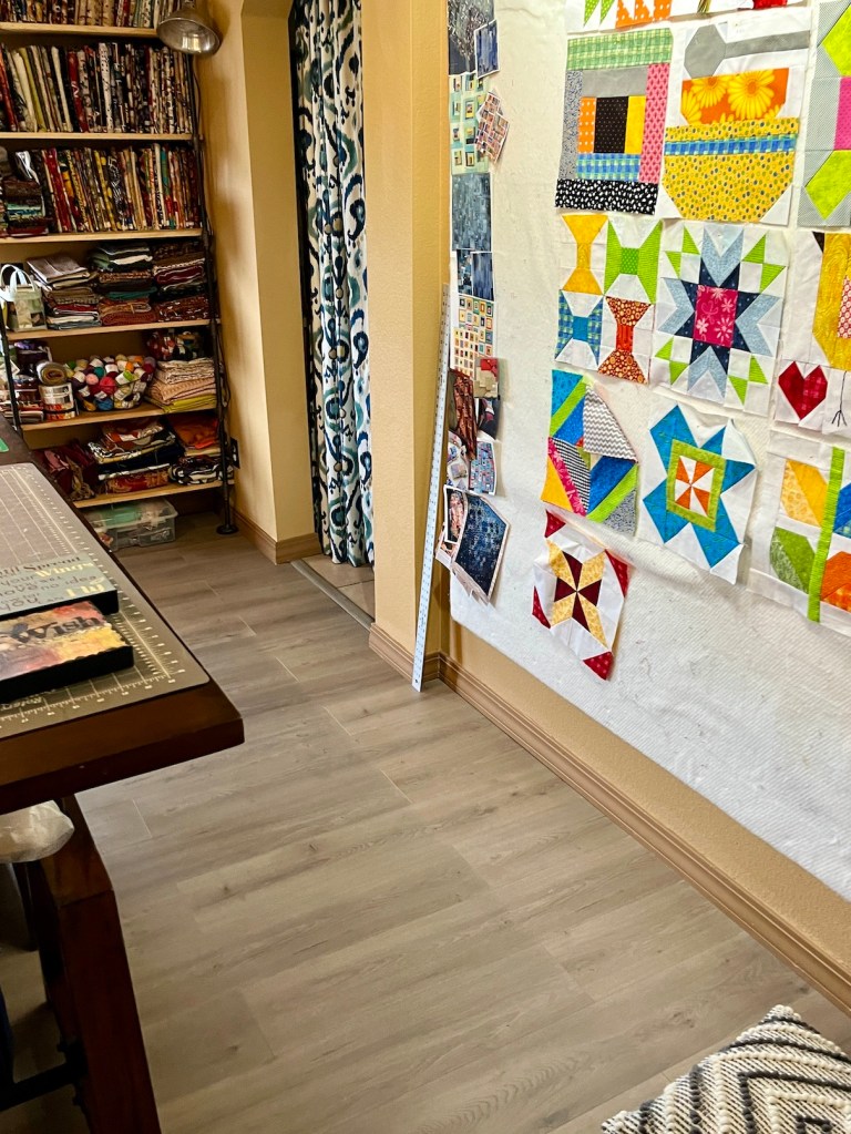 My studio is located in the former Primary Bedroom of the house. A couple years ago my husband John and I decided we didn’t need that much room for our main bedroom and moved to a smaller bedroom. Originally it was a carpeted room but in summer 2024 John put in a floor.