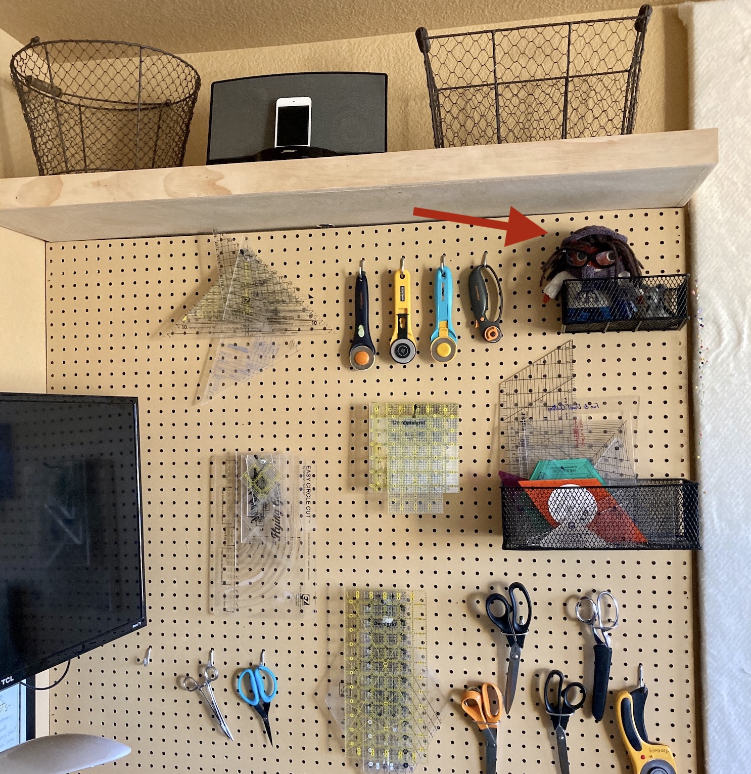 The non sewing supplies got moved to the closet in the upstairs guest room which had previous housed my clothes, which are now moved into the walk in closet off the primary bedroom.