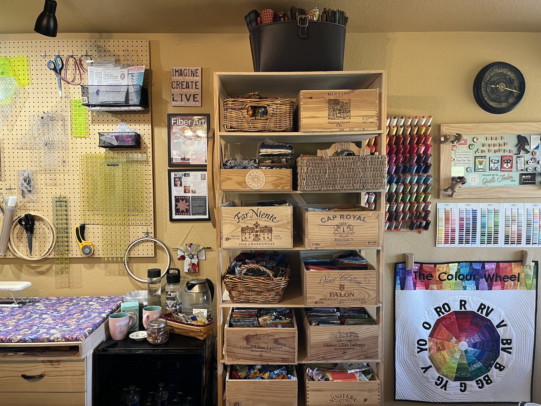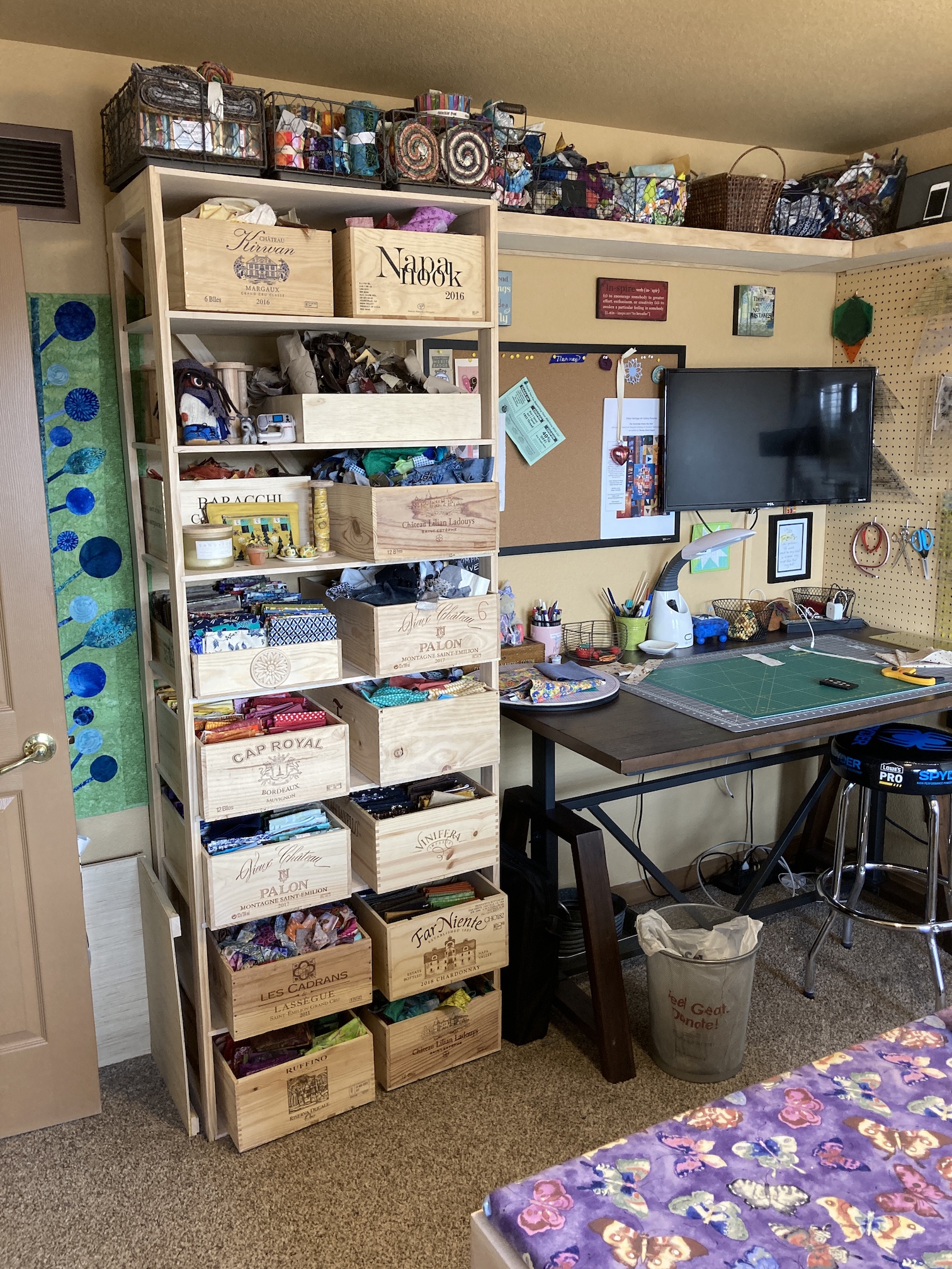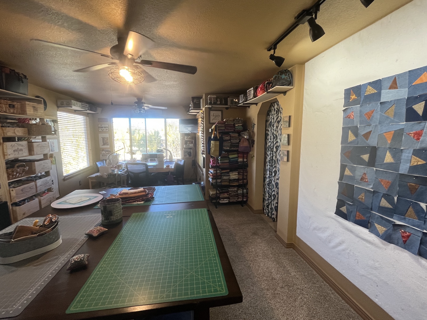 Over the next several days she unpacked her boxes (which seemed like they would never end), hung up some art and quilts on the studio wall and found a place for the large design wall her partner John built her.