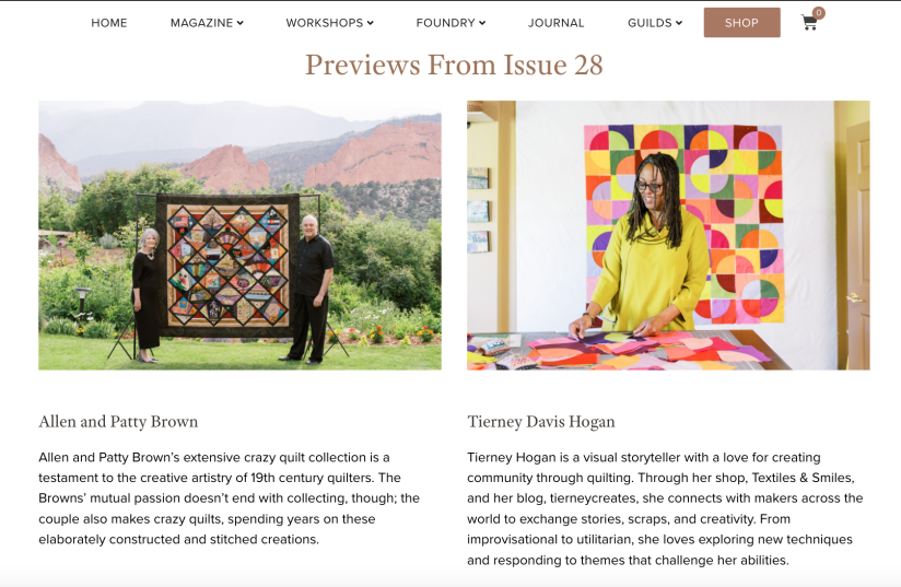 Quiltfolk Magazine has posted a preview for the issue and if you’d like to see it here is the link – Issue 28 Reveal. Here is a screen shot from that link of me (Tierney Davis Hogan):