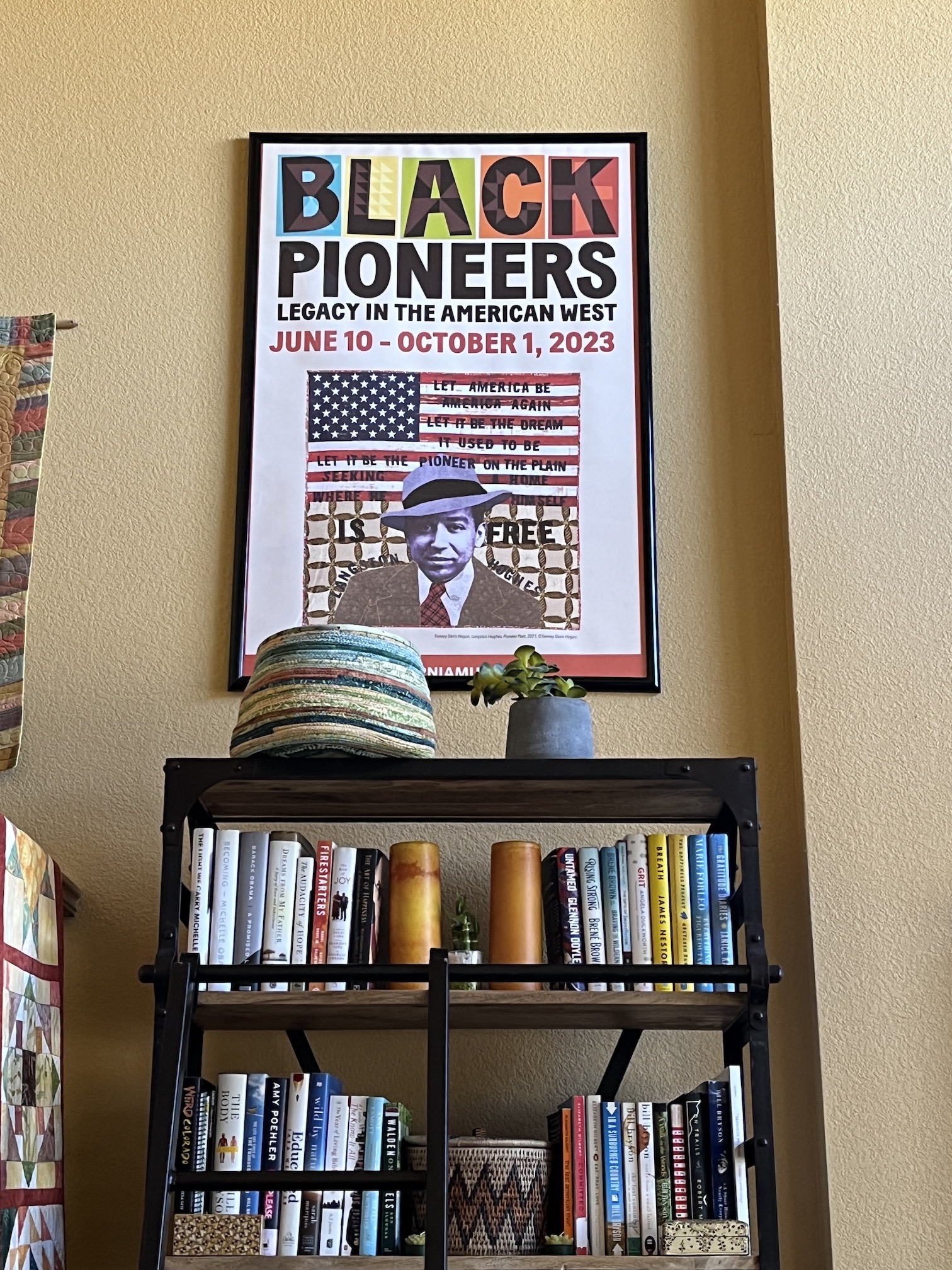 You can read more on this post I Got the Poster! , my quilt Langston Hughes: Pioneer Poet was featured on the poster for California Museum‘s leg (June 10 – October 2023) of the nationally touring show Black Pioneers: Legacy in the American West, curated by Dr. Carolyn Mazloomi. When the show concluded I was able to obtain the show poster from the museum and hang it in my living room!