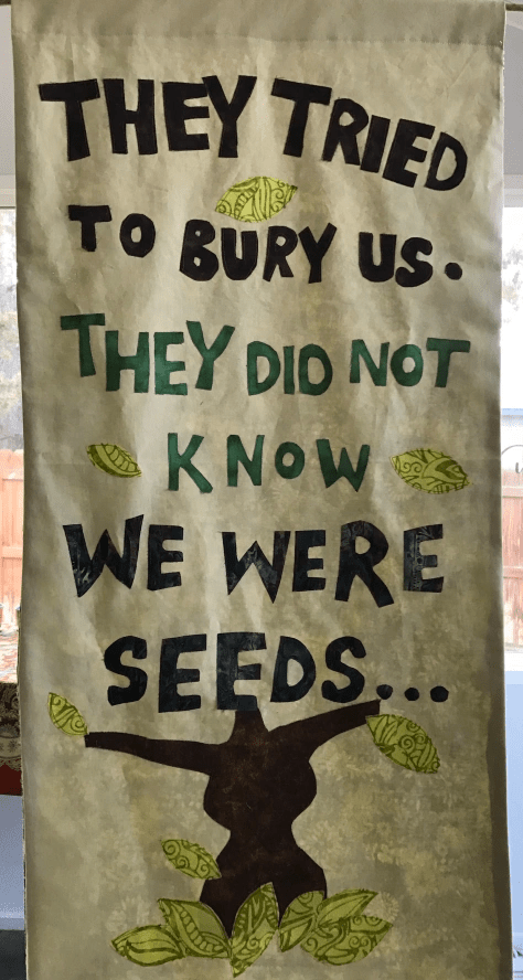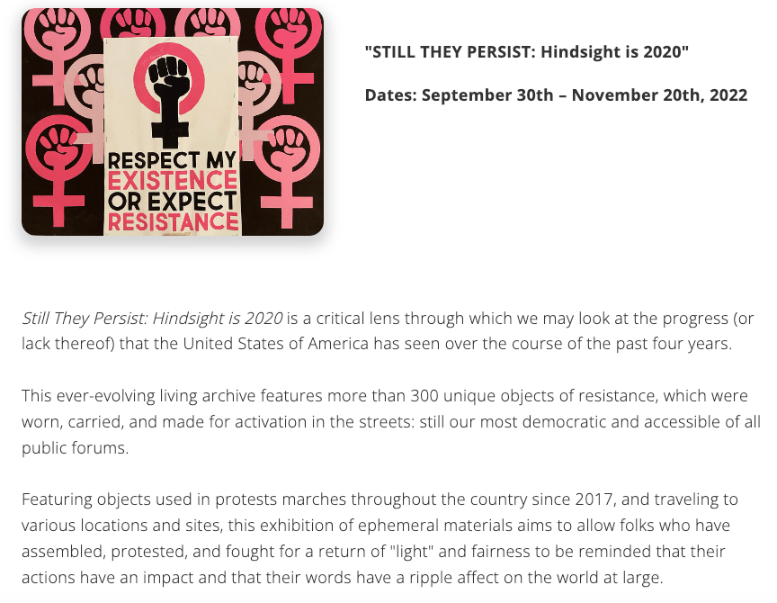 Seeds my 2017 Woman’s March banner continues to tour with the show Still They Persist: Protest Art of the 2017 Women’s Marches and is showing at the Reed Gallery of the University of Cincinnati College of Design, Architecture, Art, and Planning, September 30th to November 20th 2022.